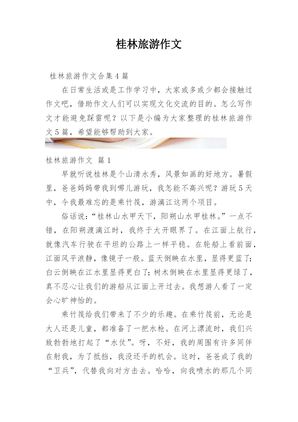 桂林旅游作文桂林旅游作文合集4篇在日常生活或是工作学习中,大家或多或少都会接触过作文吧,借助作文人们可以实现文化交流的目的。怎么写作文才能避免踩雷呢?以下是小编为大家整理的桂林旅游作文5篇,希望能够帮助到大家。桂林旅游作文篇1早就听说桂林是个山清水秀,风景如画的好地方。暑假里,爸爸妈妈带我到哪儿游玩,我怎能不高兴呢?游玩5天中,令我最难忘的是乘竹筏,游漓江这两个项目。俗话说:“桂林山水甲天下,阳朔山水甲桂林。”一点不错,在阳朔渡漓江时,我终于大开眼界了。在江面上航行,就像汽车行驶在平坦的公路上一样平稳。在
