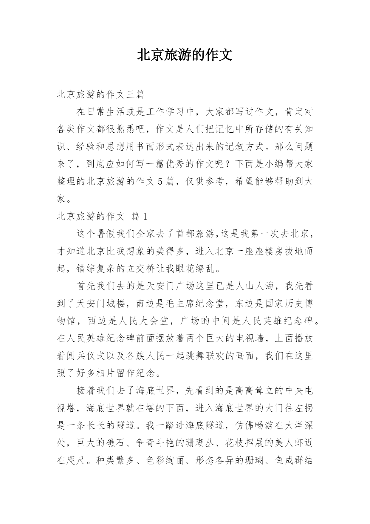 北京旅游的作文北京旅游的作文三篇在日常生活或是工作学习中,大家都写过作文,肯定对各类作文都很熟悉吧,作文是人们把记忆中所存储的有关知识、经验和思想用书面形式表达出来的记叙方式。那么问题来了,到底应如何写一篇优秀的作文呢?下面是小编帮大家整理的北京旅游的作文5篇,仅供参考,希望能够帮助到大家。北京旅游的作文篇1这个暑假我们全家去了首都旅游,这是我第一次去北京,才知道北京比我想象的美得多,进入北京一座座楼房拔地而起,错综复杂的立交桥让我眼花缭乱。首先我们去的是天安门广场这里已是人山人海,我先看到了天安门城楼,