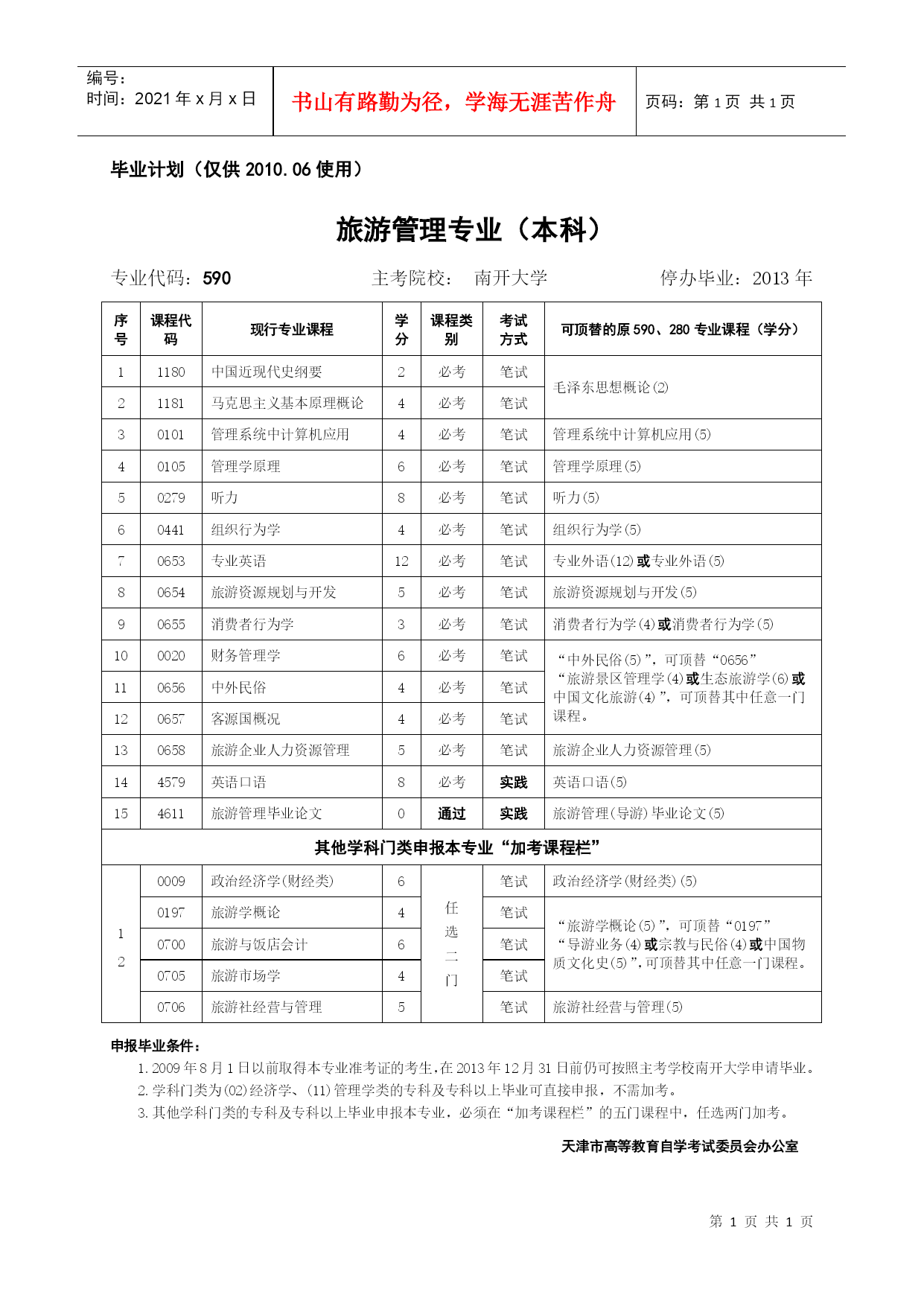 编号:时间:2021年x月x日书山有路勤为径,学海无涯苦作舟页码:第PAGE1页共NUMPAGES1页第PAGE\*MERGEFORMAT1页共NUMPAGES\*MERGEFORMAT1页毕业计划(仅供2010.06使用)旅游管理专业(本科)专业代码:590主考院校:南开大学停办毕业:2013年序号课程代码现行专业课程学分课程类别考试方式可顶替的原590、280专业课程(学分)11180中国近现代史纲要2必考笔试毛泽东思想概论(2)21181马克思主义基本原理概论4必考笔试301
