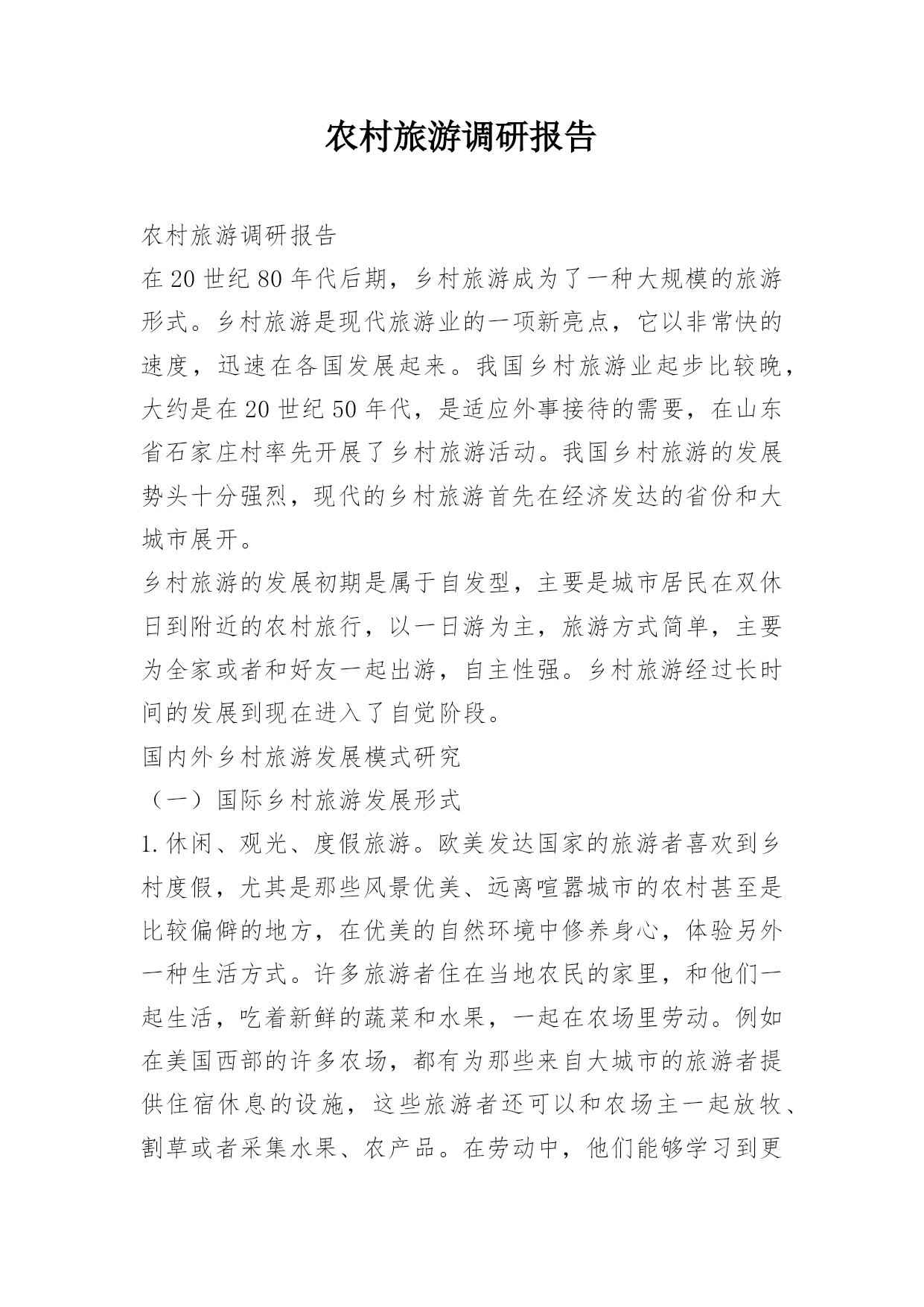 农村旅游调研报告农村旅游调研报告在20世纪80年代后期,乡村旅游成为了一种大规模的旅游形式。乡村旅游是现代旅游业的一项新亮点,它以非常快的速度,迅速在各国发展起来。我国乡村旅游业起步比较晚,大约是在20世纪50年代,是适应外事接待的需要,在山东省石家庄村率先开展了乡村旅游活动。我国乡村旅游的发展势头十分强烈,现代的乡村旅游首先在经济发达的省份和大城市展开。乡村旅游的发展初期是属于自发型,主要是城市居民在双休日到附近的农村旅行,以一日游为主,旅游方式简单,主要为全家或者和好友一起出游,自主性强。乡村旅游经过