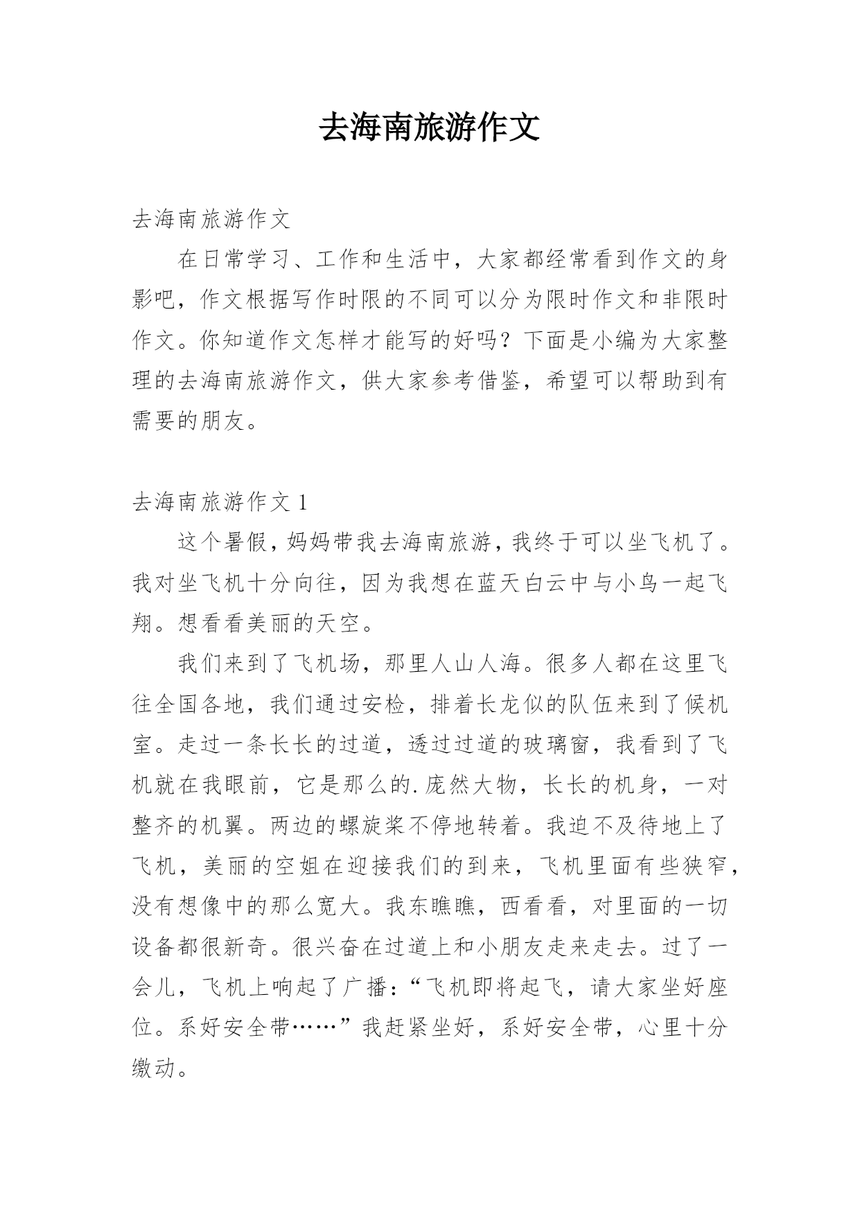 去海南旅游作文去海南旅游作文在日常学习、工作和生活中,大家都经常看到作文的身影吧,作文根据写作时限的不同可以分为限时作文和非限时作文。你知道作文怎样才能写的好吗?下面是小编为大家整理的去海南旅游作文,供大家参考借鉴,希望可以帮助到有需要的朋友。去海南旅游作文1这个暑假,妈妈带我去海南旅游,我终于可以坐飞机了。我对坐飞机十分向往,因为我想在蓝天白云中与小鸟一起飞翔。想看看美丽的天空。我们来到了飞机场,那里人山人海。很多人都在这里飞往全国各地,我们通过安检,排着长龙似的队伍来到了候机室。走过一条长长的过道,透