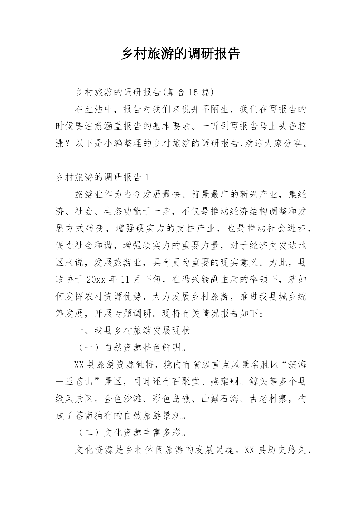 乡村旅游的调研报告乡村旅游的调研报告(集合15篇)在生活中,报告对我们来说并不陌生,我们在写报告的时候要注意涵盖报告的基本要素。一听到写报告马上头昏脑涨?以下是小编整理的乡村旅游的调研报告,欢迎大家分享。乡村旅游的调研报告1旅游业作为当今发展最快、前景最广的新兴产业,集经济、社会、生态功能于一身,不仅是推动经济结构调整和发展方式转变,增强硬实力的支柱产业,也是推动社会进步,促进社会和谐,增强软实力的重要力量,对于经济欠发达地区来说,发展旅游业,具有更为重要的现实意义。为此,县政协于20xx年11月下旬,在