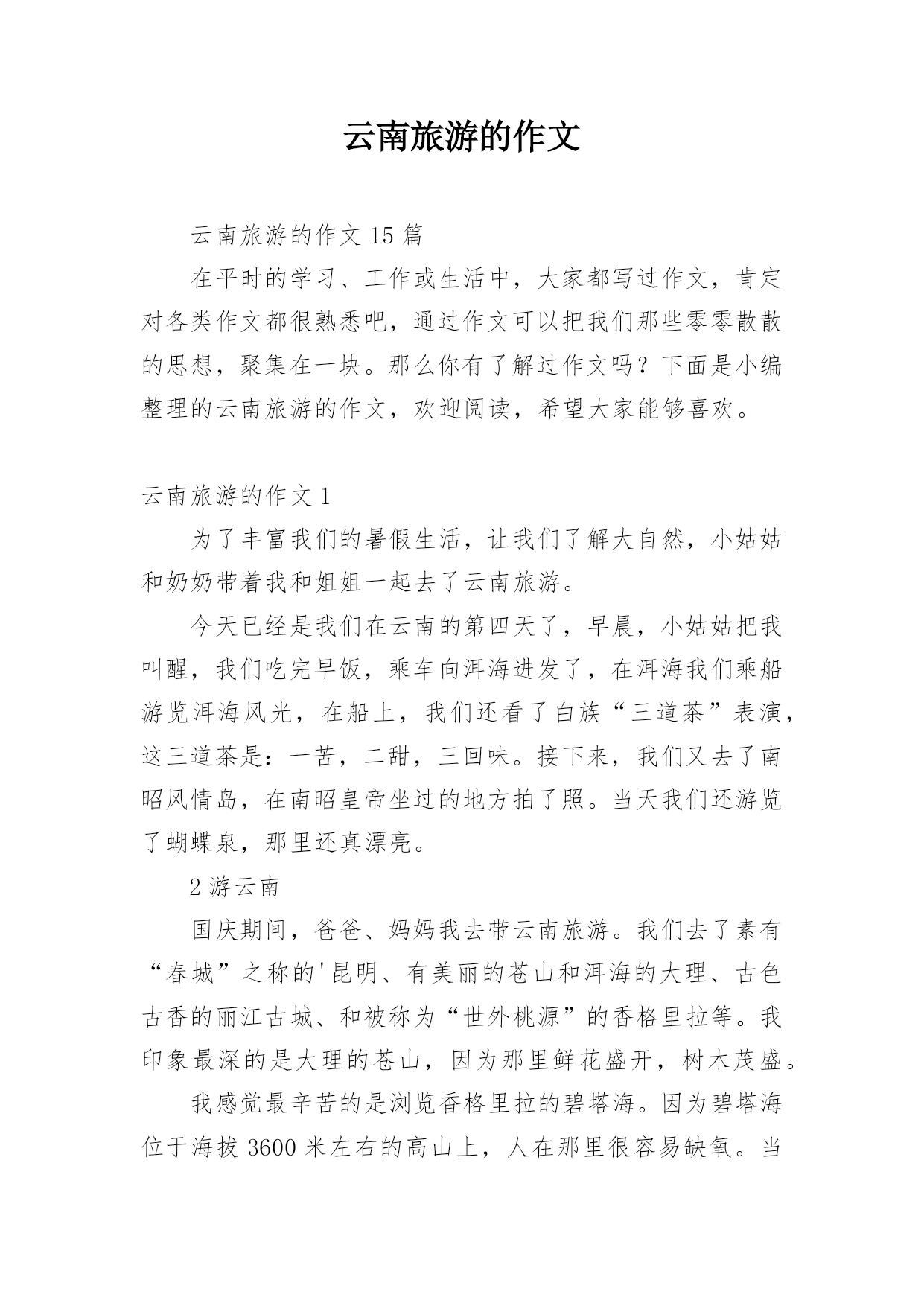 云南旅游的作文云南旅游的作文15篇在平时的学习、工作或生活中,大家都写过作文,肯定对各类作文都很熟悉吧,通过作文可以把我们那些零零散散的思想,聚集在一块。那么你有了解过作文吗?下面是小编整理的云南旅游的作文,欢迎阅读,希望大家能够喜欢。云南旅游的作文1为了丰富我们的暑假生活,让我们了解大自然,小姑姑和奶奶带着我和姐姐一起去了云南旅游。今天已经是我们在云南的第四天了,早晨,小姑姑把我叫醒,我们吃完早饭,乘车向洱海进发了,在洱海我们乘船游览洱海风光,在船上,我们还看了白族“三道茶”表演,这三道茶是:一苦,二甜