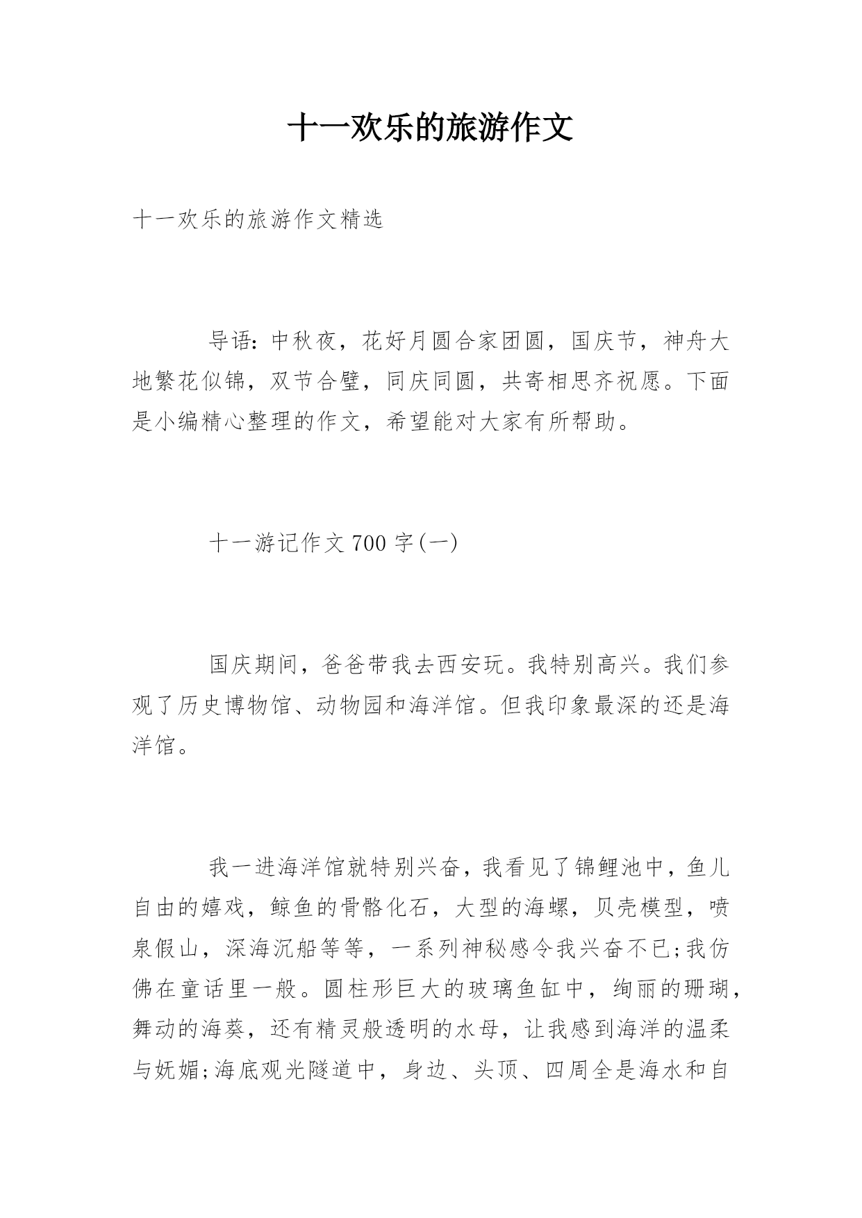 十一欢乐的旅游作文十一欢乐的旅游作文精选导语:中秋夜,花好月圆合家团圆,国庆节,神舟大地繁花似锦,双节合璧,同庆同圆,共寄相思齐祝愿。下面是小编精心整理的作文,希望能对大家有所帮助。十一游记作文700字(一)国庆期间,爸爸带我去西安玩。我特别高兴。我们参观了历史博物馆、动物园和海洋馆。但我印象最深的还是海洋馆。我一进海洋馆就特别兴奋,我看见了锦鲤池中,鱼儿自由的嬉戏,鲸鱼的骨骼化石,大型的海螺,贝壳模型,喷泉假山,深海沉船等等,一系列神秘感令我兴奋不已;我仿佛在童话里一般。圆柱形巨大的玻璃鱼缸中,绚丽的珊