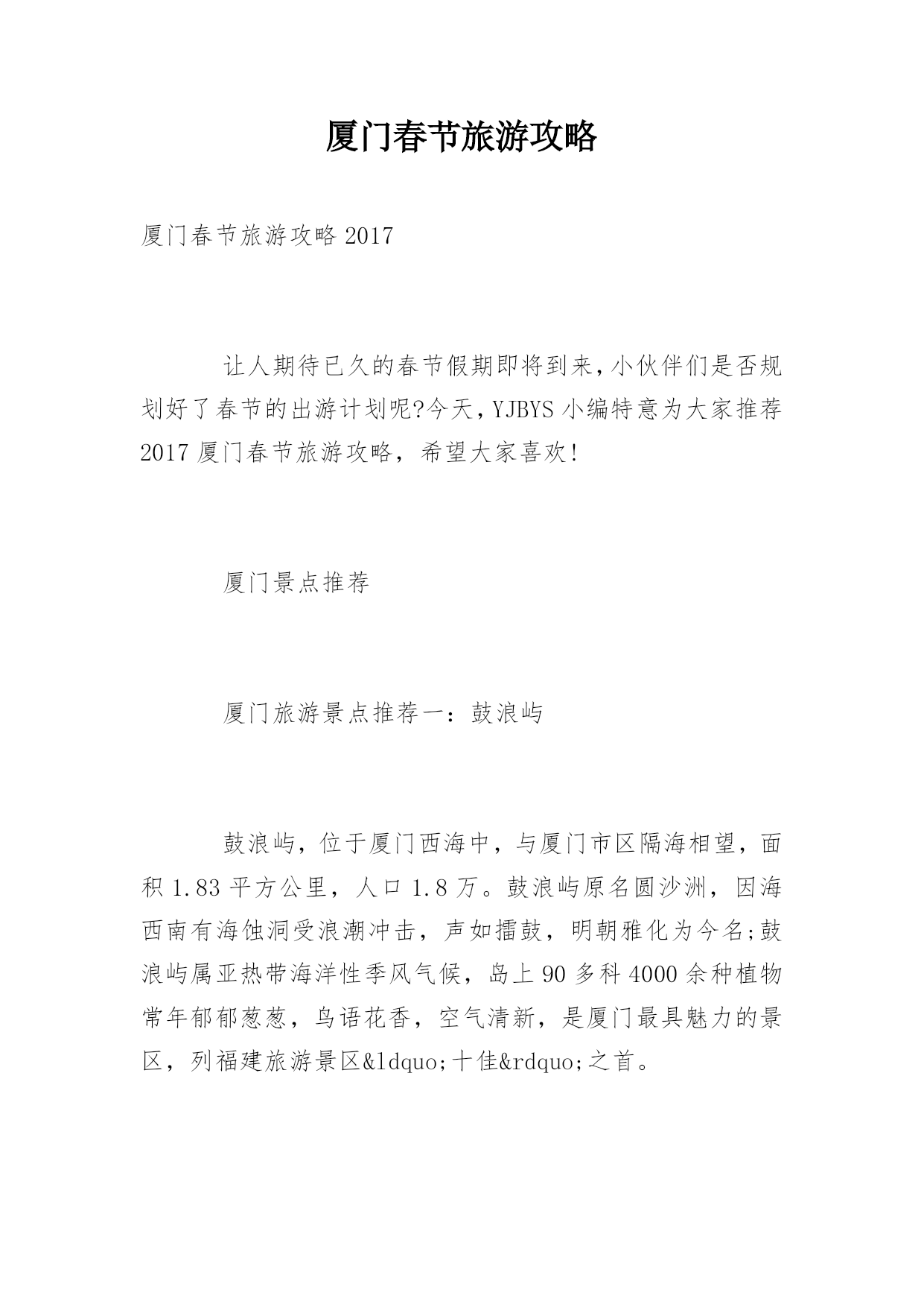 厦门春节旅游攻略厦门春节旅游攻略2017让人期待已久的春节假期即将到来,小伙伴们是否规划好了春节的出游计划呢?今天,YJBYS小编特意为大家推荐2017厦门春节旅游攻略,希望大家喜欢!厦门景点推荐厦门旅游景点推荐一:鼓浪屿鼓浪屿,位于厦门西海中,与厦门市区隔海相望,面积1.83平方公里,人口1.8万。鼓浪屿原名圆沙洲,因海西南有海蚀洞受浪潮冲击,声如擂鼓,明朝雅化为今名;鼓浪屿属亚热带海洋性季风气候,岛上90多科4000余种植物常年郁郁葱葱,鸟语花香,空气清新,是厦门最具魅力的景区,列福建旅游景区&ldq