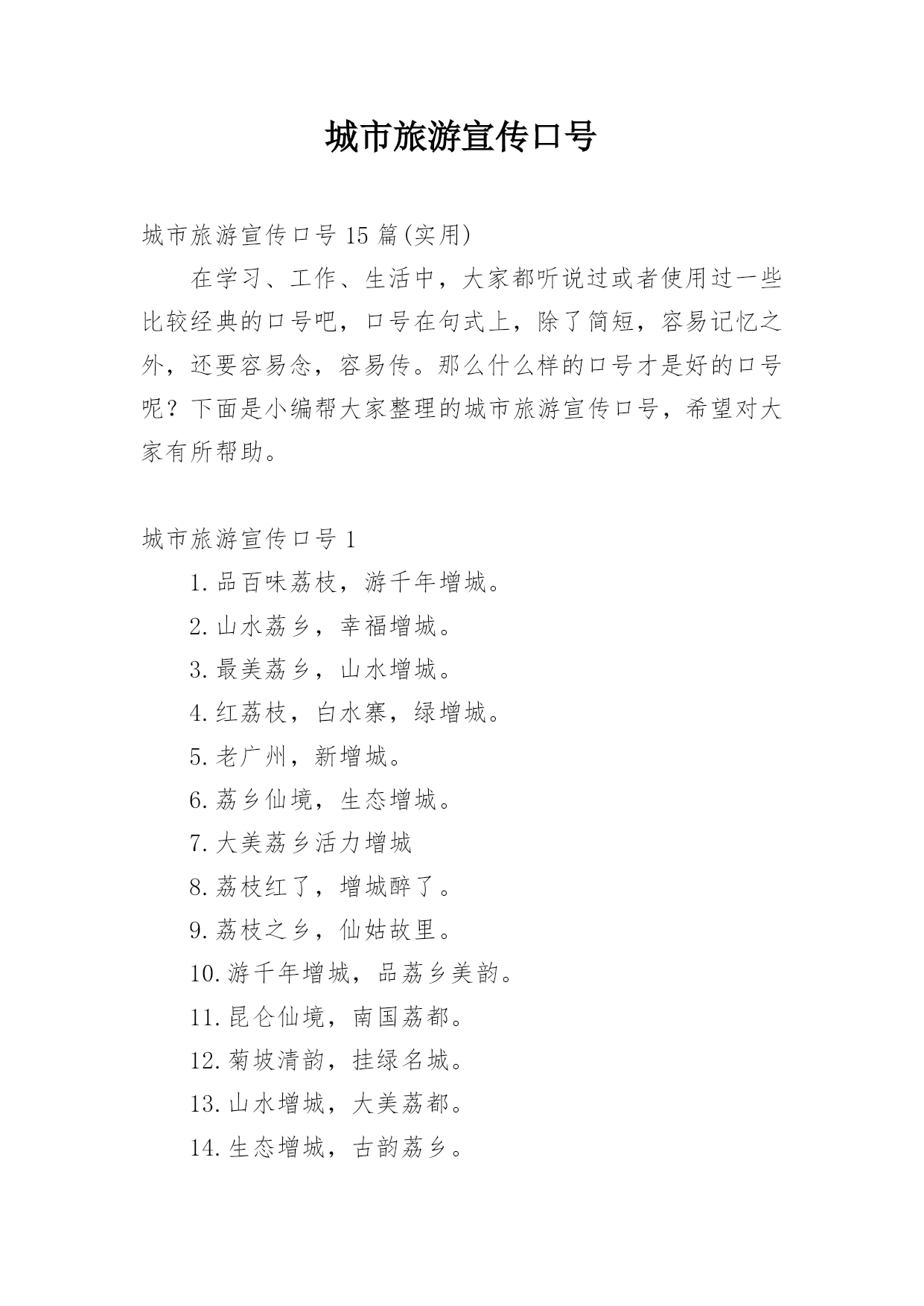 城市旅游宣传口号城市旅游宣传口号15篇(实用)在学习、工作、生活中,大家都听说过或者使用过一些比较经典的口号吧,口号在句式上,除了简短,容易记忆之外,还要容易念,容易传。那么什么样的口号才是好的口号呢?下面是小编帮大家整理的城市旅游宣传口号,希望对大家有所帮助。城市旅游宣传口号11.品百味荔枝,游千年增城。2.山水荔乡,幸福增城。3.最美荔乡,山水增城。4.红荔枝,白水寨,绿增城。5.老广州,新增城。6.荔乡仙境,生态增城。7.大美荔乡活力增城8.荔枝红了,增城醉了。9.荔枝之乡,仙姑故里。10.游千年增