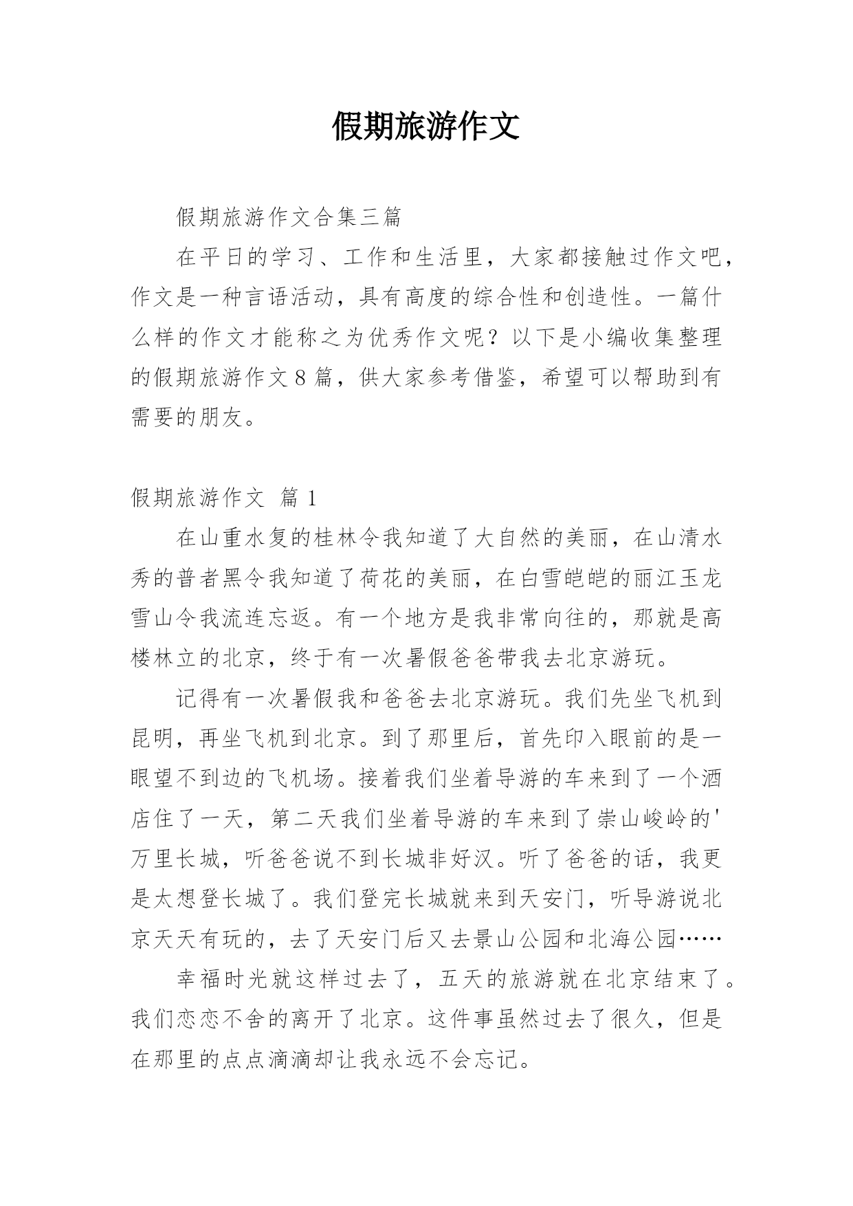假期旅游作文假期旅游作文合集三篇在平日的学习、工作和生活里,大家都接触过作文吧,作文是一种言语活动,具有高度的综合性和创造性。一篇什么样的作文才能称之为优秀作文呢?以下是小编收集整理的假期旅游作文8篇,供大家参考借鉴,希望可以帮助到有需要的朋友。假期旅游作文篇1在山重水复的桂林令我知道了大自然的美丽,在山清水秀的普者黑令我知道了荷花的美丽,在白雪皑皑的丽江玉龙雪山令我流连忘返。有一个地方是我非常向往的,那就是高楼林立的北京,终于有一次暑假爸爸带我去北京游玩。记得有一次暑假我和爸爸去北京游玩。我们先坐飞机到