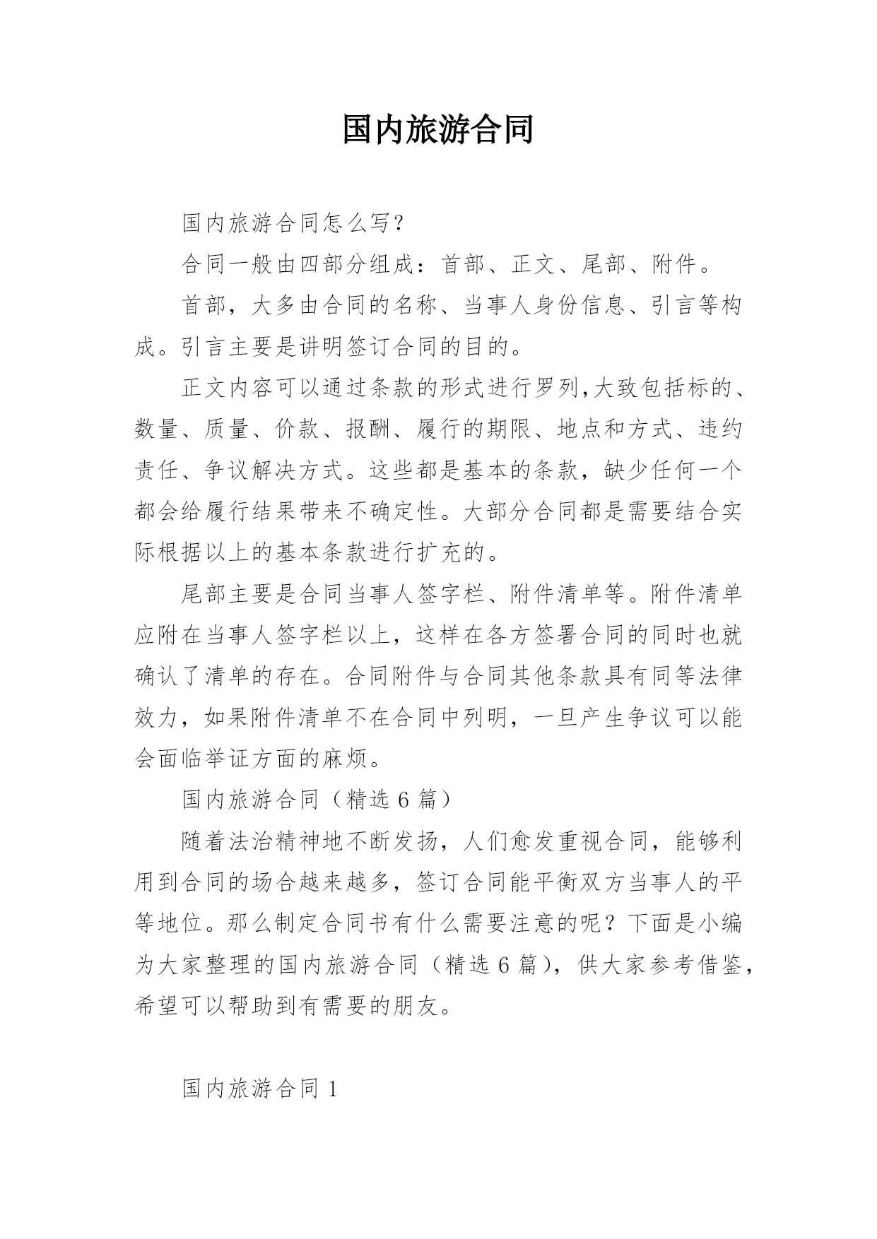国内旅游合同国内旅游合同怎么写?合同一般由四部分组成:首部、正文、尾部、附件。首部,大多由合同的名称、当事人身份信息、引言等构成。引言主要是讲明签订合同的目的。正文内容可以通过条款的形式进行罗列,大致包括标的、数量、质量、价款、报酬、履行的期限、地点和方式、违约责任、争议解决方式。这些都是基本的条款,缺少任何一个都会给履行结果带来不确定性。大部分合同都是需要结合实际根据以上的基本条款进行扩充的。尾部主要是合同当事人签字栏、附件清单等。附件清单应附在当事人签字栏以上,这样在各方签署合同的同时也就确认了清单的