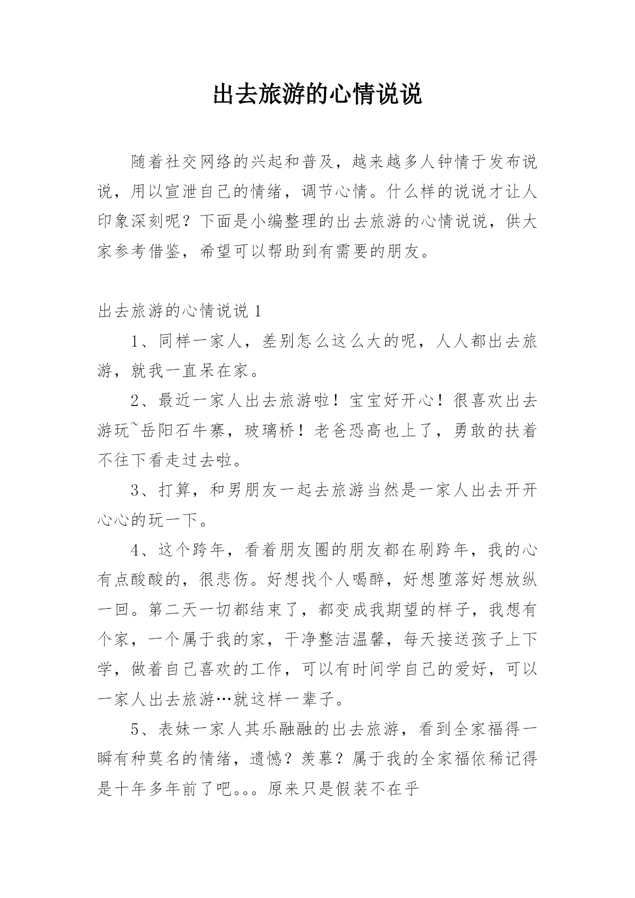 出去旅游的心情说说随着社交网络的兴起和普及,越来越多人钟情于发布说说,用以宣泄自己的情绪,调节心情。什么样的说说才让人印象深刻呢?下面是小编整理的出去旅游的心情说说,供大家参考借鉴,希望可以帮助到有需要的朋友。出去旅游的心情说说11、同样一家人,差别怎么这么大的呢,人人都出去旅游,就我一直呆在家。2、最近一家人出去旅游啦!宝宝好开心!很喜欢出去游玩~岳阳石牛寨,玻璃桥!老爸恐高也上了,勇敢的扶着不往下看走过去啦。3、打算,和男朋友一起去旅游当然是一家人出去开开心心的玩一下。4、这个跨年,看着朋友圈的朋友都