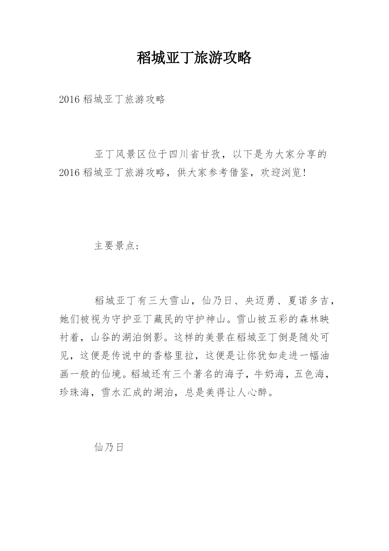 稻城亚丁旅游攻略2016稻城亚丁旅游攻略亚丁风景区位于四川省甘孜,以下是为大家分享的2016稻城亚丁旅游攻略,供大家参考借鉴,欢迎浏览!主要景点:稻城亚丁有三大雪山,仙乃日、央迈勇、夏诺多吉,她们被视为守护亚丁藏民的守护神山。雪山被五彩的森林映衬着,山谷的湖泊倒影。这样的美景在稻城亚丁倒是随处可见,这便是传说中的香格里拉,这便是让你犹如走进一幅油画一般的仙境。稻城还有三个著名的海子,牛奶海,五色海,珍珠海,雪水汇成的湖泊,总是美得让人心醉。仙乃日仙乃日(意为“观音菩萨”,藏语意为&
