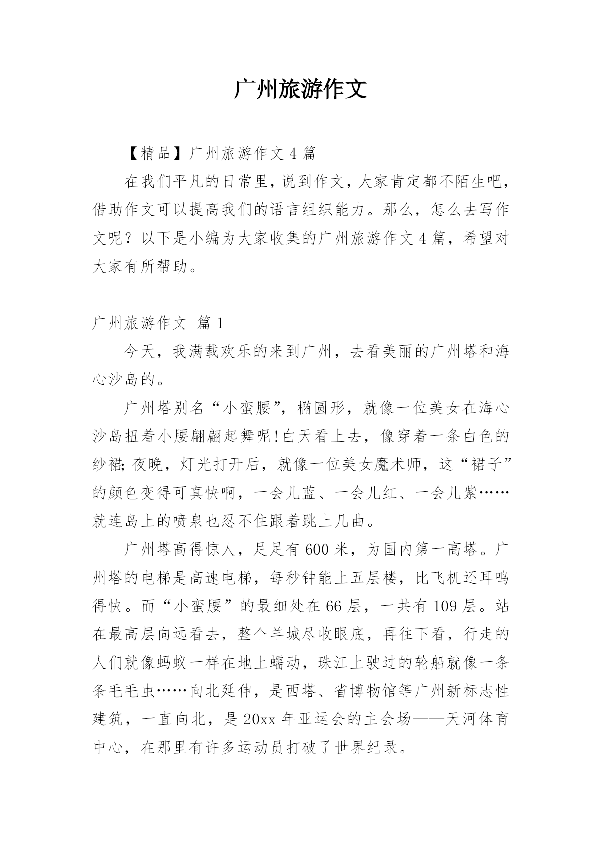 广州旅游作文【精品】广州旅游作文4篇在我们平凡的日常里,说到作文,大家肯定都不陌生吧,借助作文可以提高我们的语言组织能力。那么,怎么去写作文呢?以下是小编为大家收集的广州旅游作文4篇,希望对大家有所帮助。广州旅游作文篇1今天,我满载欢乐的来到广州,去看美丽的广州塔和海心沙岛的。广州塔别名“小蛮腰”,椭圆形,就像一位美女在海心沙岛扭着小腰翩翩起舞呢!白天看上去,像穿着一条白色的纱裙;夜晚,灯光打开后,就像一位美女魔术师,这“裙子”的颜色变得可真快啊,一会儿蓝、一会儿红、一会儿紫……就连岛上的喷泉也忍不住跟着