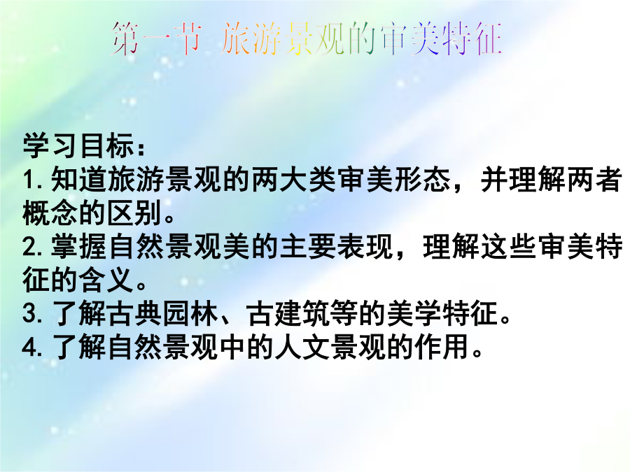 学习目标:1.知道旅游景观的两大类审美形态,并理解两者概念的区别。2.掌握自然景观美的主要表现,理解这些审美特征的含义。3.了解古典园林、古建筑等的美学特征。4.了解自然景观中的人文景观的作用。一、自然美泰山天下华山天下峨眉天下青城天下雄五岳南岳衡山北岳恒山中岳嵩山色彩美是以色彩的冷、暖等色调,以及它们的对比、协调等组合关系表现出来的形式美。欣赏者对色彩美的感受,既受到生理因素的影响,也有明显的地方、民族和历史时代的特征海之美霞之美叶之美花之美花海花卉经济——云南旅游景观的色彩美飞瀑、流水使自然景观富有动
