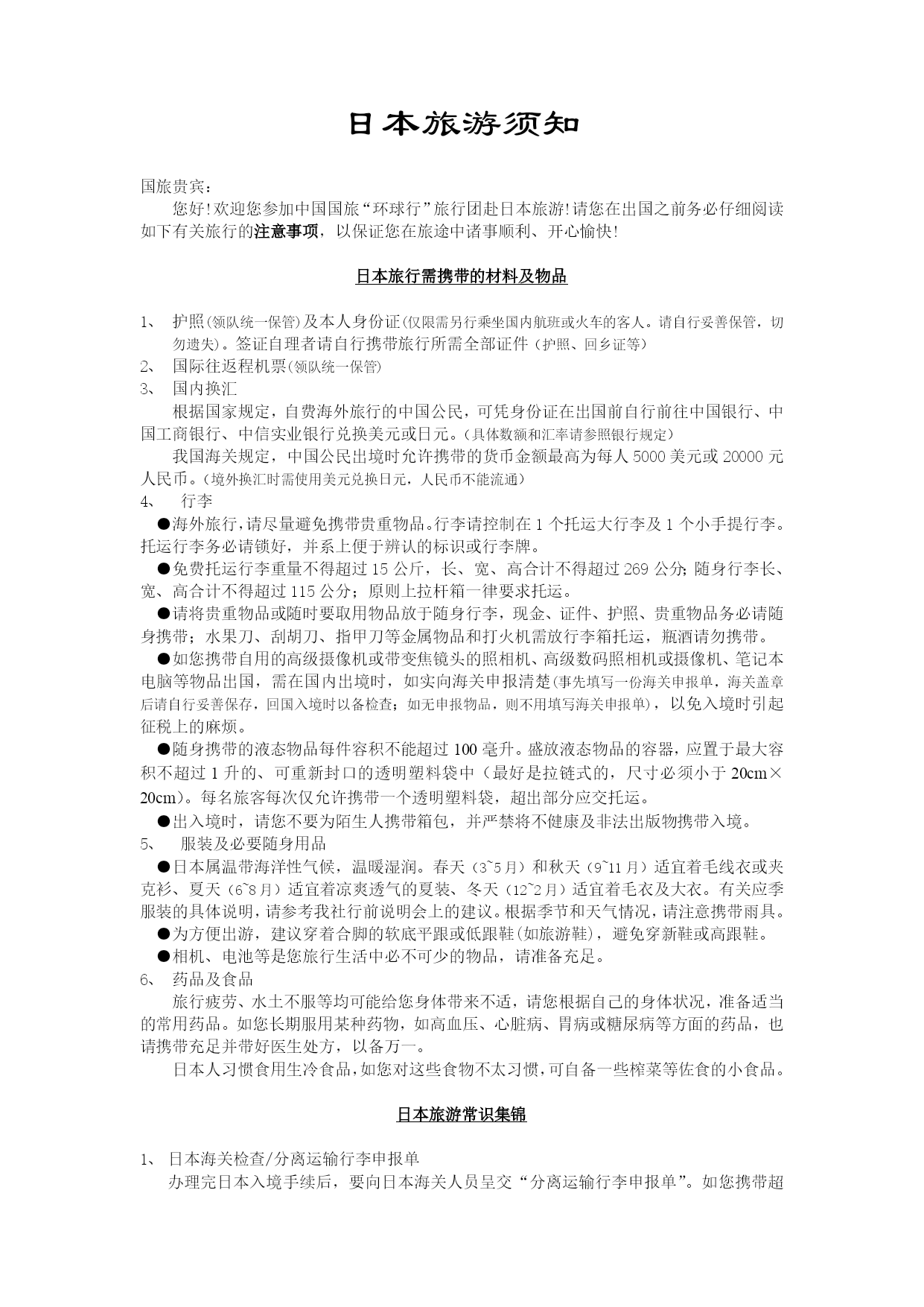 日本旅游须知国旅贵宾:您好!欢迎您参加中国国旅“环球行”旅行团赴日本旅游!请您在出国之前务必仔细阅读如下有关旅行的注意事项,以保证您在旅途中诸事顺利、开心愉快!日本旅行需携带的材料及物品1、护照(领队统一保管)及本人身份证(仅限需另行乘坐国内航班或火车的客人。请自行妥善保管,切勿遗失)。签证自理者请自行携带旅行所需全部证件(护照、回乡证等)2、国际往返程机票(领队统一保管)3、国内换汇根据国家规定,自费海外旅行的中国公民,可凭身份证在出国前自行前往中国银行、中国工商银行、中信实业银行兑换美元或日元。(具体