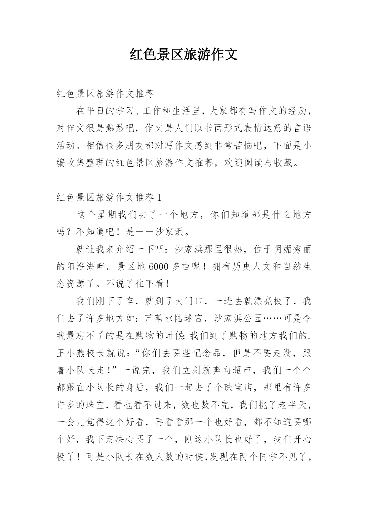 红色景区旅游作文红色景区旅游作文推荐在平日的学习、工作和生活里,大家都有写作文的经历,对作文很是熟悉吧,作文是人们以书面形式表情达意的言语活动。相信很多朋友都对写作文感到非常苦恼吧,下面是小编收集整理的红色景区旅游作文推荐,欢迎阅读与收藏。红色景区旅游作文推荐1这个星期我们去了一个地方,你们知道那是什么地方吗?不知道吧!是――沙家浜。就让我来介绍一下吧:沙家浜那里很热,位于明媚秀丽的阳澄湖畔。景区地6000多亩呢!拥有历史人文和自然生态资源了。不说了往下看!我们刚下了车,就到了大门口,一进去就漂亮极了,我
