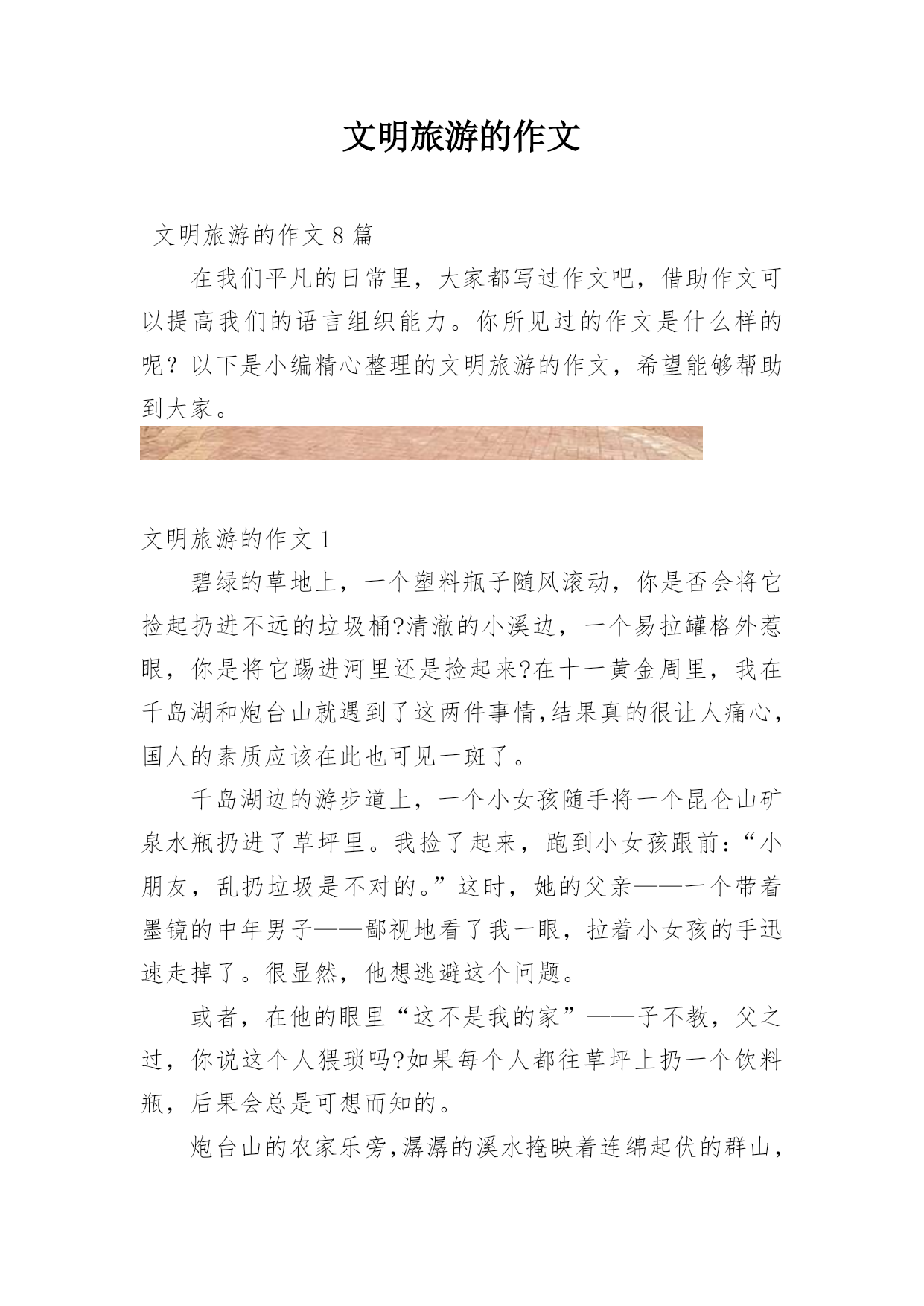 文明旅游的作文文明旅游的作文8篇在我们平凡的日常里,大家都写过作文吧,借助作文可以提高我们的语言组织能力。你所见过的作文是什么样的呢?以下是小编精心整理的文明旅游的作文,希望能够帮助到大家。文明旅游的作文1碧绿的草地上,一个塑料瓶子随风滚动,你是否会将它捡起扔进不远的垃圾桶?清澈的小溪边,一个易拉罐格外惹眼,你是将它踢进河里还是捡起来?在十一黄金周里,我在千岛湖和炮台山就遇到了这两件事情,结果真的很让人痛心,国人的素质应该在此也可见一斑了。千岛湖边的游步道上,一个小女孩随手将一个昆仑山矿泉水瓶扔进了草坪里