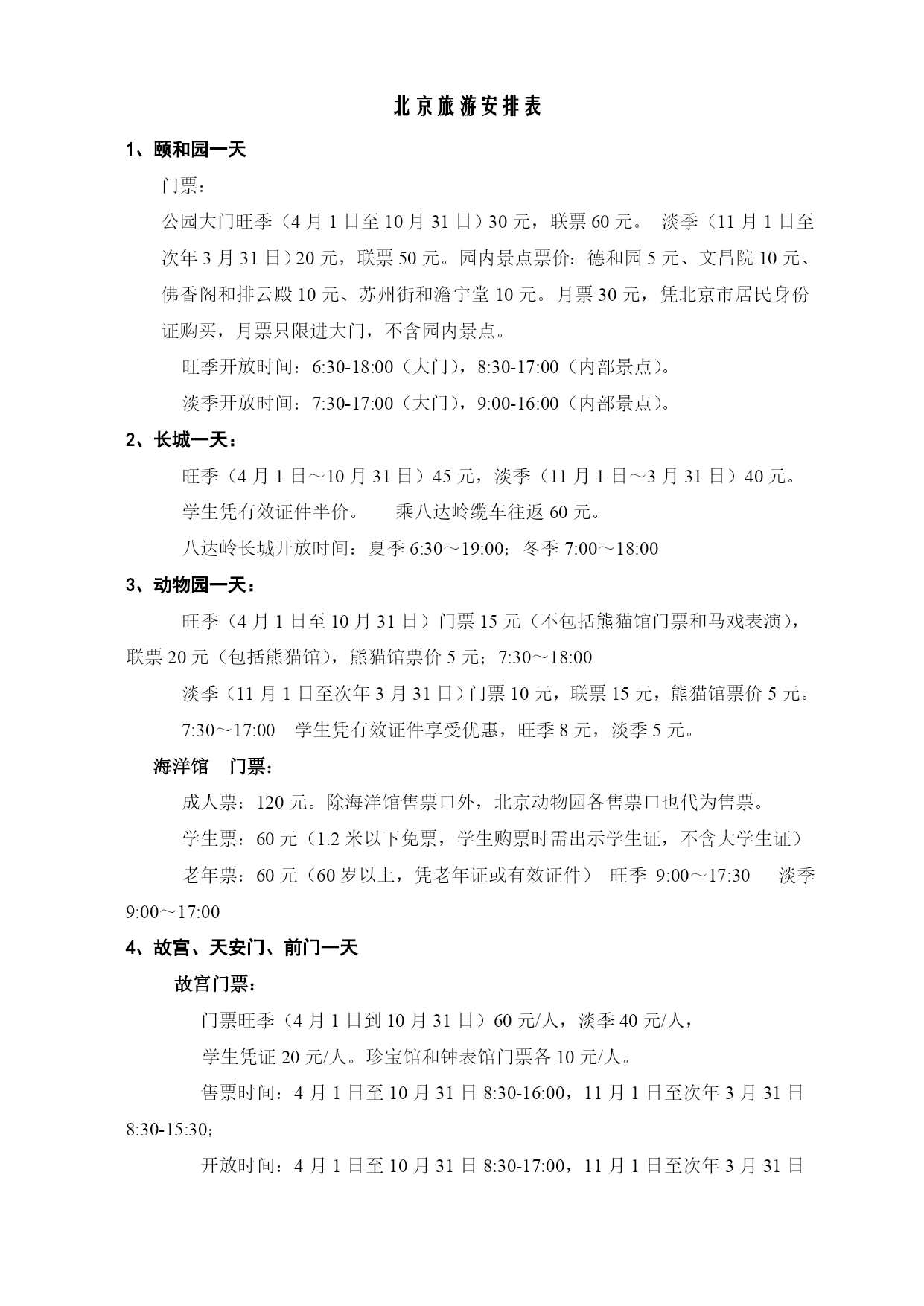 北京旅游安排表1、颐和园一天门票:公园大门旺季(4月1日至10月31日)30元,联票60元。淡季(11月1日至次年3月31日)20元,联票50元。园内景点票价:德和园5元、文昌院10元、佛香阁和排云殿10元、苏州街和澹宁堂10元。月票30元,凭北京市居民身份证购买,月票只限进大门,不含园内景点。旺季开放时间:6:30-18:00(大门),8:30-17:00(内部景点)。淡季开放时间:7:30-17:00(大门),9:00-16:00(内部景点)。2、长城一天:旺季(4月1日~10月31日)45元,淡季(