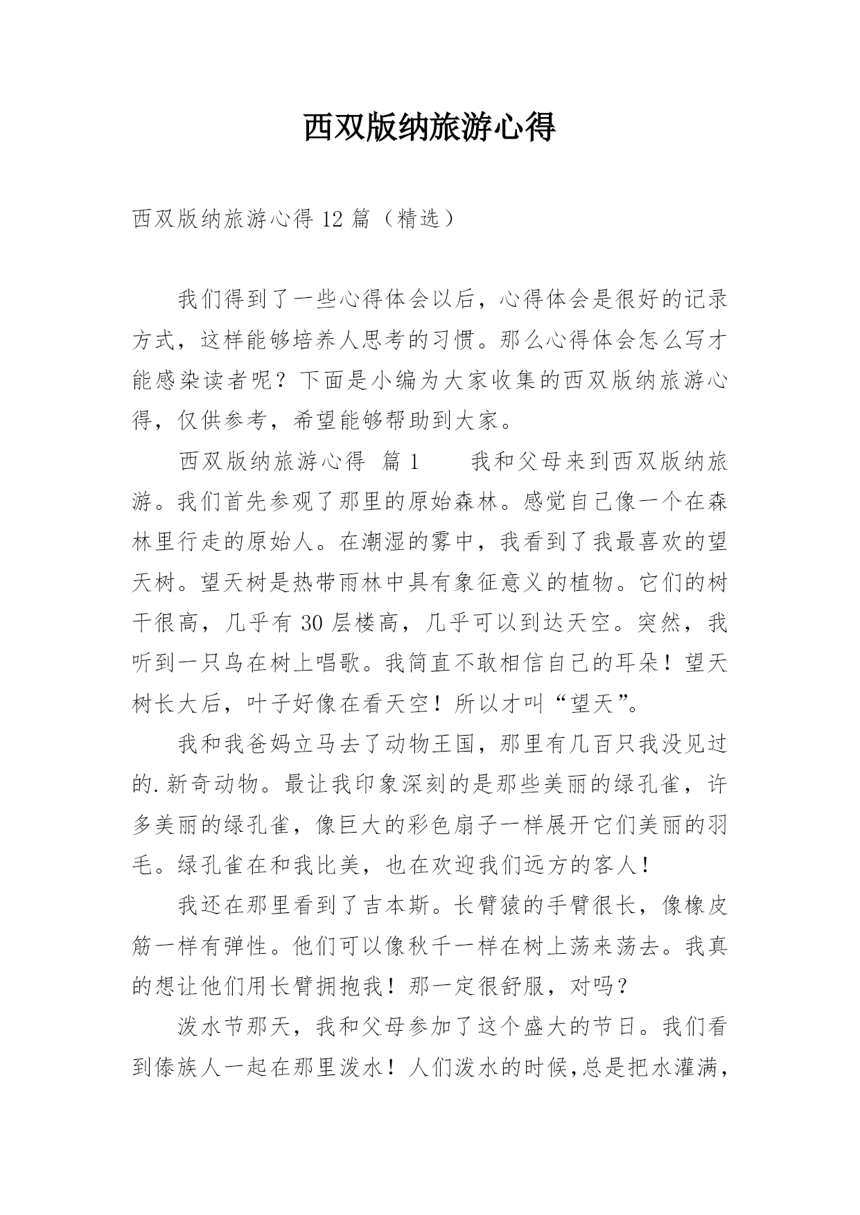 西双版纳旅游心得西双版纳旅游心得12篇(精选)我们得到了一些心得体会以后,心得体会是很好的记录方式,这样能够培养人思考的习惯。那么心得体会怎么写才能感染读者呢?下面是小编为大家收集的西双版纳旅游心得,仅供参考,希望能够帮助到大家。西双版纳旅游心得篇1我和父母来到西双版纳旅游。我们首先参观了那里的原始森林。感觉自己像一个在森林里行走的原始人。在潮湿的雾中,我看到了我最喜欢的望天树。望天树是热带雨林中具有象征意义的植物。它们的树干很高,几乎有30层楼高,几乎可以到达天空。突然,我听到一只鸟在树上唱歌。我简直不