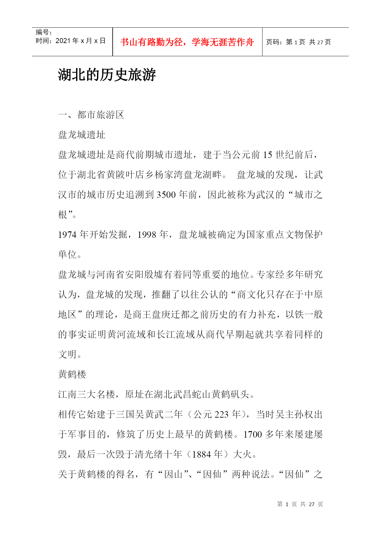 编号:时间:2021年x月x日书山有路勤为径,学海无涯苦作舟页码:第PAGE27页共NUMPAGES27页第PAGE\*MERGEFORMAT27页共NUMPAGES\*MERGEFORMAT27页湖北的历史旅游一、都市旅游区盘龙城遗址盘龙城遗址是商代前期城市遗址,建于当公元前15世纪前后,位于湖北省黄陂叶店乡杨家湾盘龙湖畔。盘龙城的发现,让武汉市的城市历史追溯到3500年前,因此被称为武汉的“城市之根”。1974年开始发掘,1998年,盘龙城被确定为国家重点文物保护单位。盘龙城与