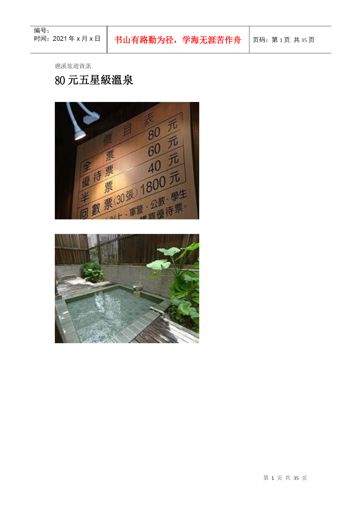 编号:时间:2021年x月x日书山有路勤为径,学海无涯苦作舟页码:第PAGE35页共NUMPAGES35页第PAGE\*MERGEFORMAT35页共NUMPAGES\*MERGEFORMAT35页礁溪旅遊資訊80元五星級溫泉在礁溪這挖到了一處價格超~~親切的溫泉,在這不但泡腳免~~錢,就連你想泡全身的話也只要花你一個便當錢80塊,就可以舒服一整天喔。不過我們為各位觀眾挖到的這座溫泉叫做『湯圍溝溫泉公園』,這裡可是宜蘭縣政府為民眾設置的公用溫泉,這裡頭的池子更是用檜木打造,真的算的