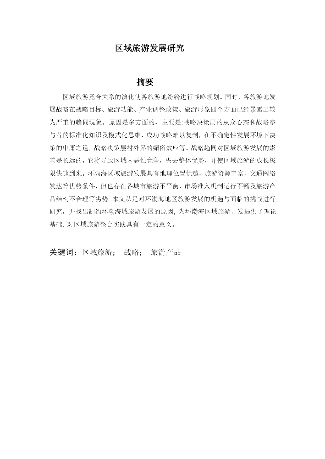 区域旅游发展研究摘要区域旅游竞合关系的演化使各旅游地纷纷进行战略规划。同时,各旅游地发展战略在战略目标、旅游功能、产业调整政策、旅游形象四个方面已经暴露出较为严重的趋同现象。原因是多方面的,主要是:战略决策层的从众心态和战略参与者的标准化知识及模式化思维,成功战略难以复制,在不确定性发展环境下决策的中庸之道,战略决策层衬外界的媚俗效应等。战略趋同对区域旅游发展的影响是长远的,它将导致区域内恶性竞争,失去整体优势,并使区域旅游的成长极限快速到来。环渤海区域旅游发展具有地理位置优越、旅游资源丰富、交通网络发达