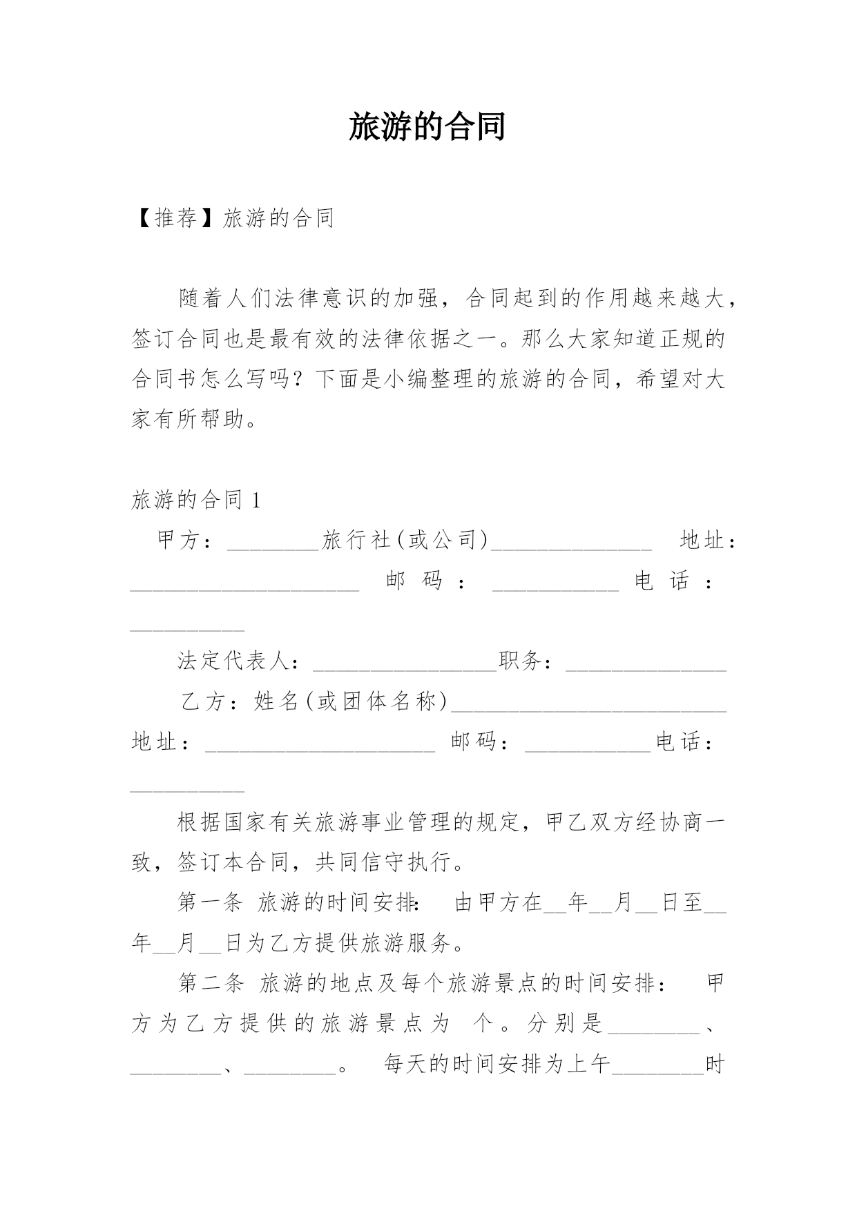旅游的合同【推荐】旅游的合同随着人们法律意识的加强,合同起到的作用越来越大,签订合同也是最有效的法律依据之一。那么大家知道正规的合同书怎么写吗?下面是小编整理的旅游的合同,希望对大家有所帮助。旅游的合同1甲方:________旅行社(或公司)______________地址:____________________邮码:___________电话:__________法定代表人:________________职务:______________乙方:姓名(或团体名称)___________________