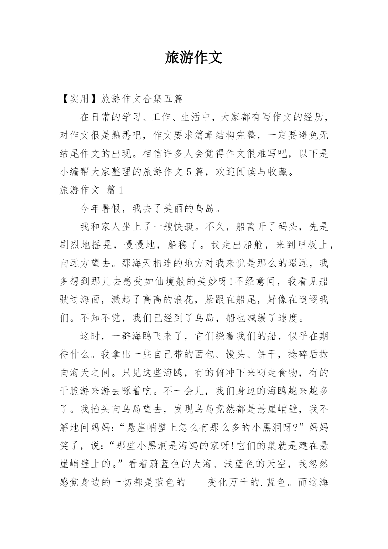 旅游作文【实用】旅游作文合集五篇在日常的学习、工作、生活中,大家都有写作文的经历,对作文很是熟悉吧,作文要求篇章结构完整,一定要避免无结尾作文的出现。相信许多人会觉得作文很难写吧,以下是小编帮大家整理的旅游作文5篇,欢迎阅读与收藏。旅游作文篇1今年暑假,我去了美丽的鸟岛。我和家人坐上了一艘快艇。不久,船离开了码头,先是剧烈地摇晃,慢慢地,船稳了。我走出船舱,来到甲板上,向远方望去。那海天相连的地方对我来说是那么的遥远,我多想到那儿去感受如仙境般的美妙呀!不经意间,我看见船驶过海面,溅起了高高的浪花,紧跟在