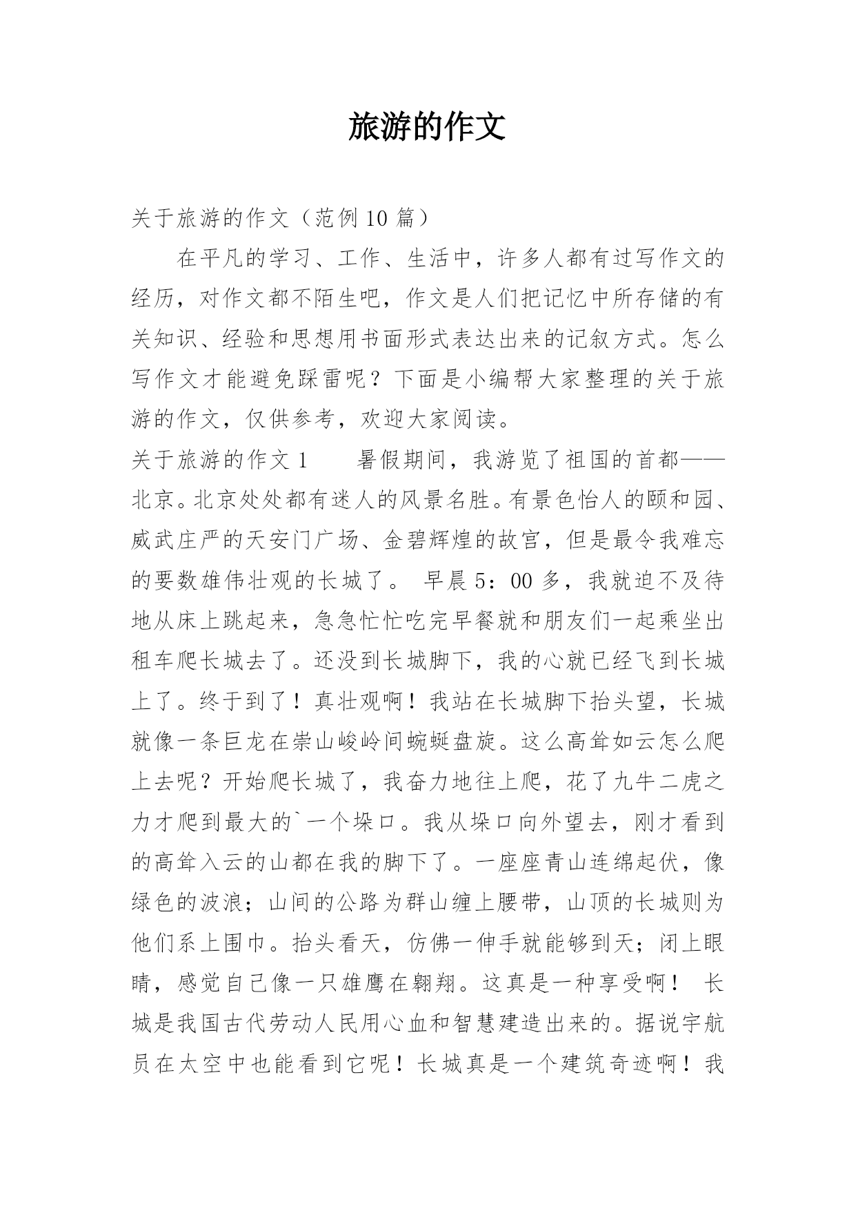 旅游的作文关于旅游的作文(范例10篇)在平凡的学习、工作、生活中,许多人都有过写作文的经历,对作文都不陌生吧,作文是人们把记忆中所存储的有关知识、经验和思想用书面形式表达出来的记叙方式。怎么写作文才能避免踩雷呢?下面是小编帮大家整理的关于旅游的作文,仅供参考,欢迎大家阅读。关于旅游的作文1暑假期间,我游览了祖国的首都——北京。北京处处都有迷人的风景名胜。有景色怡人的颐和园、威武庄严的天安门广场、金碧辉煌的故宫,但是最令我难忘的要数雄伟壮观的长城了。早晨5:00多,我就迫不及待地从床上跳起来,急急忙忙吃完早