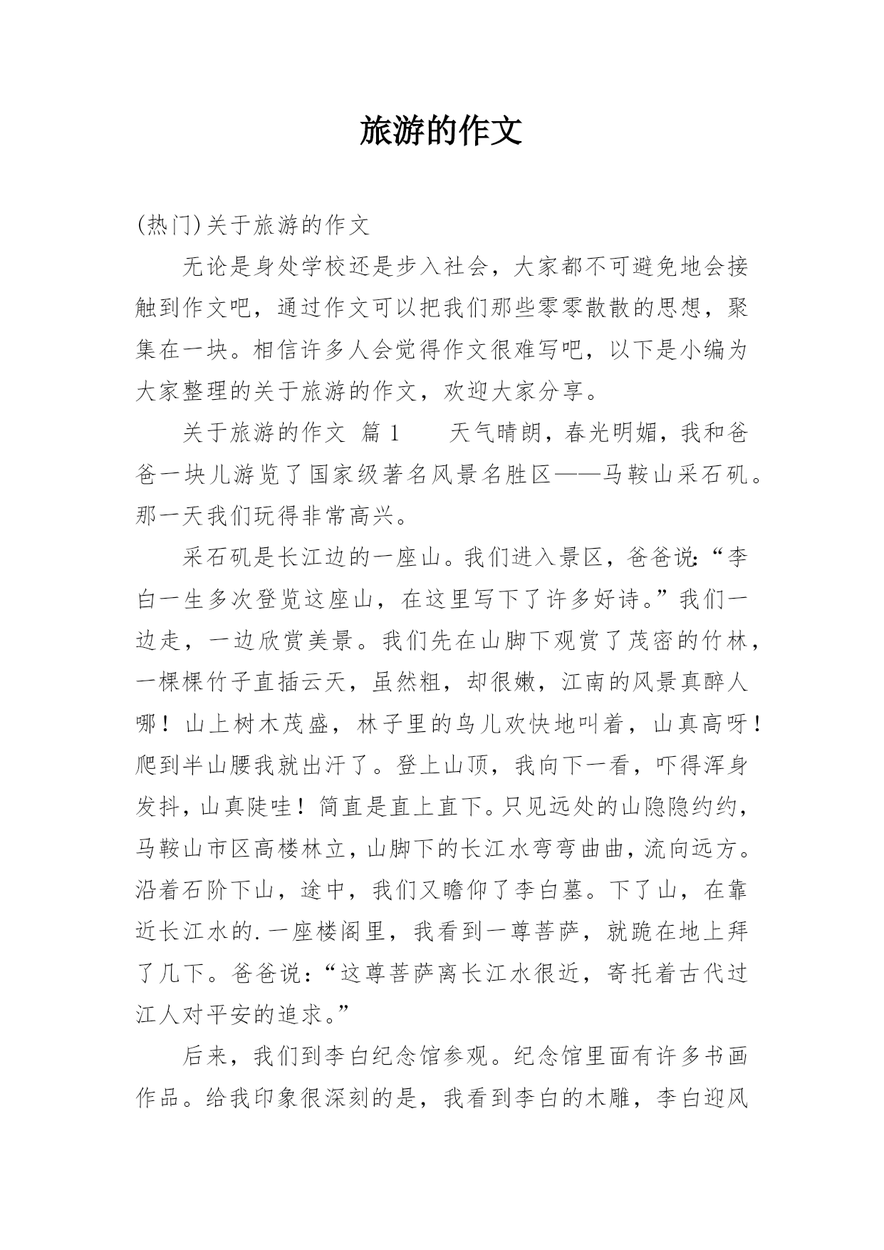 旅游的作文(热门)关于旅游的作文无论是身处学校还是步入社会,大家都不可避免地会接触到作文吧,通过作文可以把我们那些零零散散的思想,聚集在一块。相信许多人会觉得作文很难写吧,以下是小编为大家整理的关于旅游的作文,欢迎大家分享。关于旅游的作文篇1天气晴朗,春光明媚,我和爸爸一块儿游览了国家级著名风景名胜区——马鞍山采石矶。那一天我们玩得非常高兴。采石矶是长江边的一座山。我们进入景区,爸爸说:“李白一生多次登览这座山,在这里写下了许多好诗。”我们一边走,一边欣赏美景。我们先在山脚下观赏了茂密的竹林,一棵棵竹子直