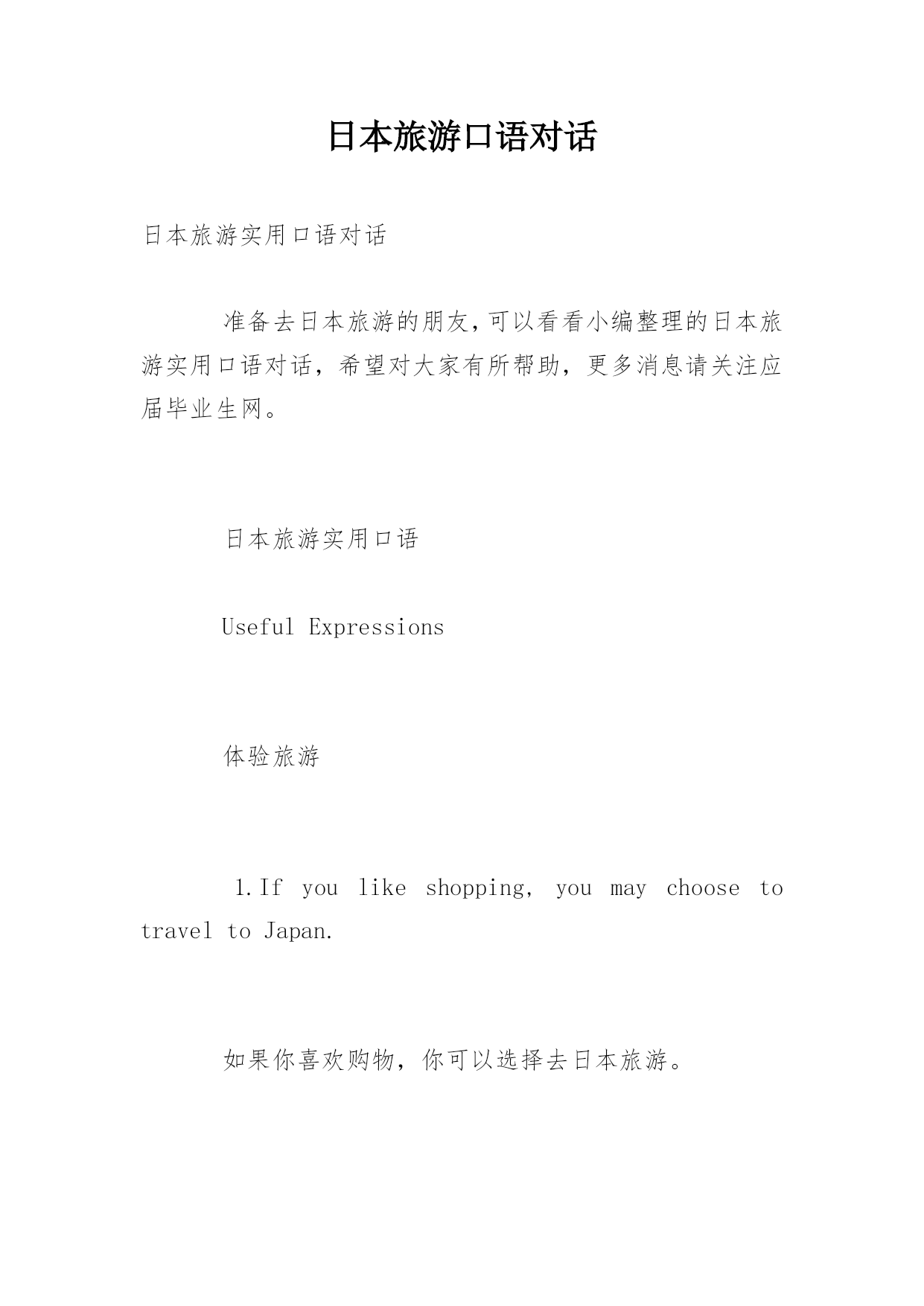 日本旅游口语对话日本旅游实用口语对话准备去日本旅游的朋友,可以看看小编整理的日本旅游实用口语对话,希望对大家有所帮助,更多消息请关注应届毕业生网。日本旅游实用口语UsefulExpressions体验旅游1.Ifyoulikeshopping,youmaychoosetotraveltoJapan.如果你喜欢购物,你可以选择去日本旅游。2.Japanistheheavenofcomicfans.日本是漫画迷的天堂。3.KimonoisthetraditionalcostumeinJapan.和服是日本的传