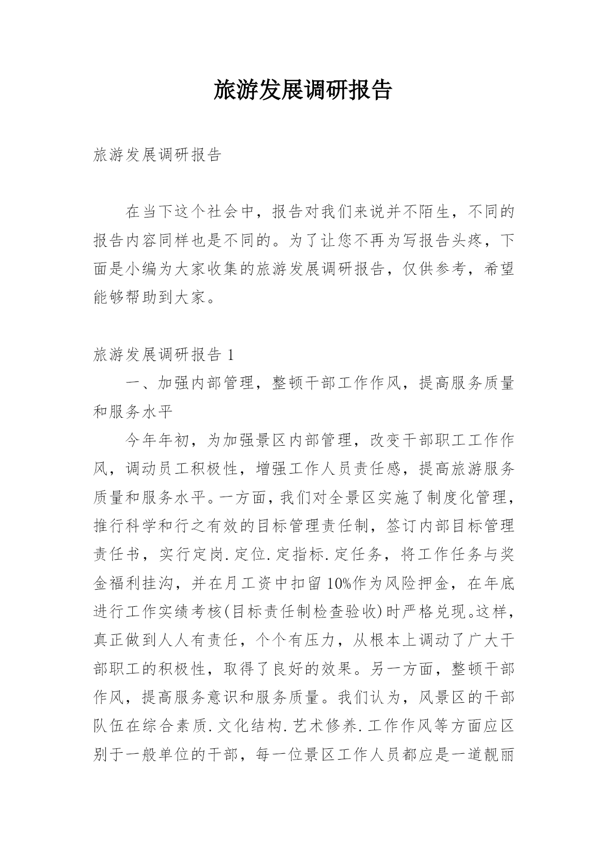旅游发展调研报告旅游发展调研报告在当下这个社会中,报告对我们来说并不陌生,不同的报告内容同样也是不同的。为了让您不再为写报告头疼,下面是小编为大家收集的旅游发展调研报告,仅供参考,希望能够帮助到大家。旅游发展调研报告1一、加强内部管理,整顿干部工作作风,提高服务质量和服务水平今年年初,为加强景区内部管理,改变干部职工工作作风,调动员工积极性,增强工作人员责任感,提高旅游服务质量和服务水平。一方面,我们对全景区实施了制度化管理,推行科学和行之有效的目标管理责任制,签订内部目标管理责任书,实行定岗.定位.定指