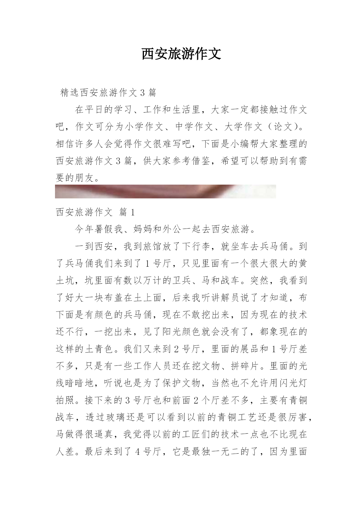 西安旅游作文精选西安旅游作文3篇在平日的学习、工作和生活里,大家一定都接触过作文吧,作文可分为小学作文、中学作文、大学作文(论文)。相信许多人会觉得作文很难写吧,下面是小编帮大家整理的西安旅游作文3篇,供大家参考借鉴,希望可以帮助到有需要的朋友。西安旅游作文篇1今年暑假我、妈妈和外公一起去西安旅游。一到西安,我到旅馆放了下行李,就坐车去兵马俑。到了兵马俑我们来到了1号厅,只见里面有一个很大很大的黄土坑,坑里面有数以万计的卫兵、马和战车。突然,我看到了好大一块布盖在土上面,后来我听讲解员说了才知道,布下面是