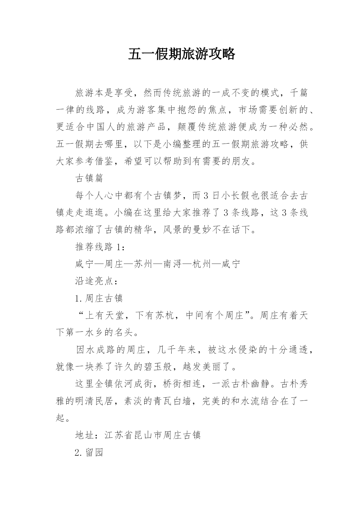 五一假期旅游攻略旅游本是享受,然而传统旅游的一成不变的模式,千篇一律的线路,成为游客集中抱怨的焦点,市场需要创新的、更适合中国人的旅游产品,颠覆传统旅游便成为一种必然。五一假期去哪里,以下是小编整理的五一假期旅游攻略,供大家参考借鉴,希望可以帮助到有需要的朋友。古镇篇每个人心中都有个古镇梦,而3日小长假也很适合去古镇走走逛逛。小编在这里给大家推荐了3条线路,这3条线路都浓缩了古镇的精华,风景的曼妙不在话下。推荐线路1:咸宁—周庄—苏州—南浔—杭州—咸宁沿途亮点:1.周庄古镇“上有天堂,下有苏杭,中间有个周