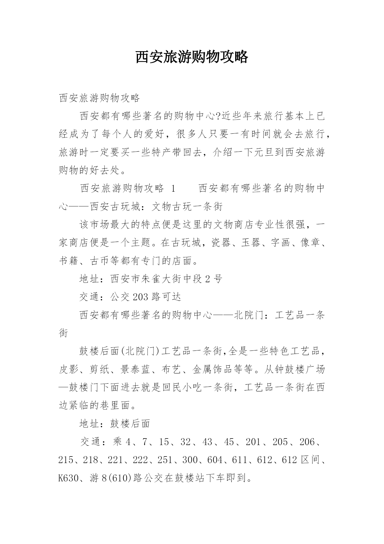 西安旅游购物攻略西安旅游购物攻略西安都有哪些著名的购物中心?近些年来旅行基本上已经成为了每个人的爱好,很多人只要一有时间就会去旅行,旅游时一定要买一些特产带回去,介绍一下元旦到西安旅游购物的好去处。西安旅游购物攻略1西安都有哪些著名的购物中心——西安古玩城:文物古玩一条街该市场最大的特点便是这里的文物商店专业性很强,一家商店便是一个主题。在古玩城,瓷器、玉器、字画、像章、书籍、古币等都有专门的店面。地址:西安市朱雀大街中段2号交通:公交203路可达西安都有哪些著名的购物中心——北院门:工艺品一条街鼓楼后面