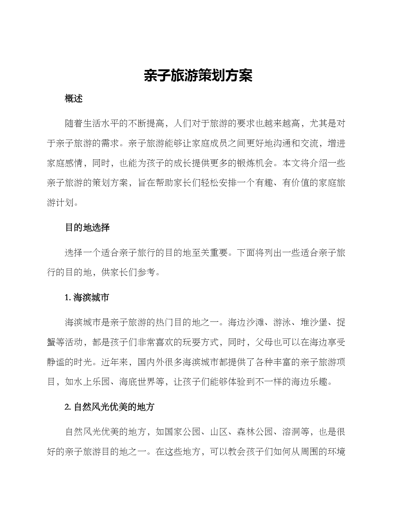 亲子旅游策划方案概述随着生活水平的不断提高,人们对于旅游的要求也越来越高,尤其是对于亲子旅游的需求。亲子旅游能够让家庭成员之间更好地沟通和交流,增进家庭感情,同时,也能为孩子的成长提供更多的锻炼机会。本文将介绍一些亲子旅游的策划方案,旨在帮助家长们轻松安排一个有趣、有价值的家庭旅游计划。目的地选择选择一个适合亲子旅行的目的地至关重要。下面将列出一些适合亲子旅行的目的地,供家长们参考。1.海滨城市海滨城市是亲子旅游的热门目的地之一。海边沙滩、游泳、堆沙堡、捉蟹等活动,都是孩子们非常喜欢的玩耍方式,同时,父母