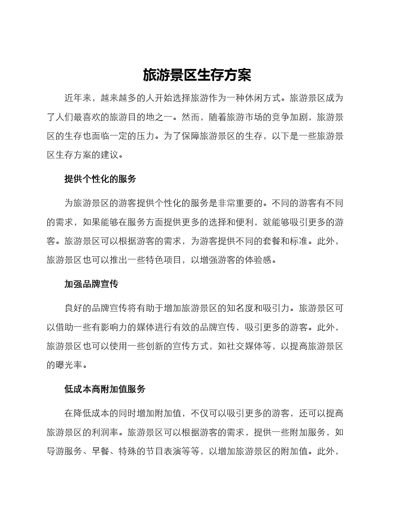 旅游景区生存方案近年来,越来越多的人开始选择旅游作为一种休闲方式。旅游景区成为了人们最喜欢的旅游目的地之一。然而,随着旅游市场的竞争加剧,旅游景区的生存也面临一定的压力。为了保障旅游景区的生存,以下是一些旅游景区生存方案的建议。提供个性化的服务为旅游景区的游客提供个性化的服务是非常重要的。不同的游客有不同的需求,如果能够在服务方面提供更多的选择和便利,就能够吸引更多的游客。旅游景区可以根据游客的需求,为游客提供不同的套餐和标准。此外,旅游景区也可以推出一些特色项目,以增强游客的体验感。加强品牌宣传良好的品