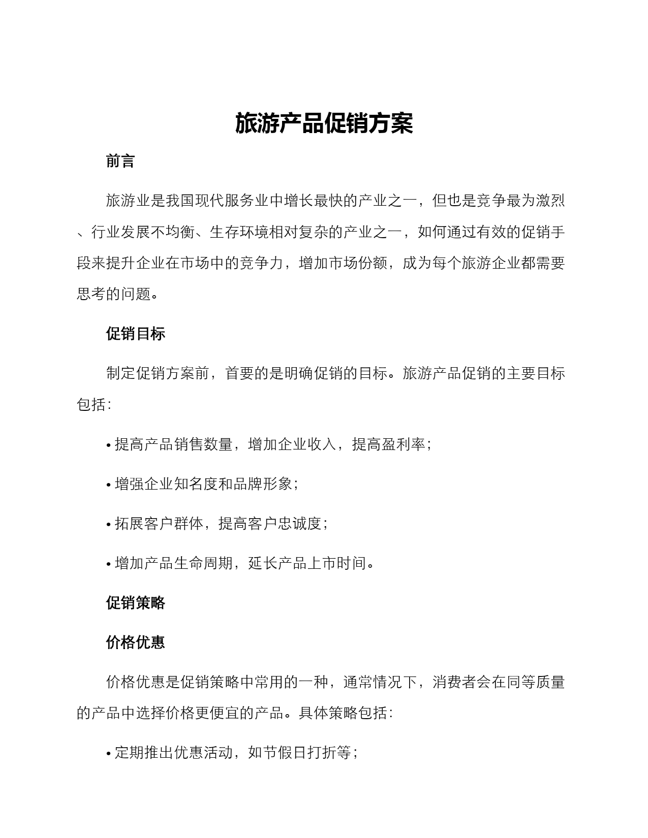 旅游产品促销方案前言旅游业是我国现代服务业中增长最快的产业之一,但也是竞争最为激烈、行业发展不均衡、生存环境相对复杂的产业之一,如何通过有效的促销手段来提升企业在市场中的竞争力,增加市场份额,成为每个旅游企业都需要思考的问题。促销目标制定促销方案前,首要的是明确促销的目标。旅游产品促销的主要目标包括:提高产品销售数量,增加企业收入,提高盈利率;增强企业知名度和品牌形象;拓展客户群体,提高客户忠诚度;增加产品生命周期,延长产品上市时间。促销策略价格优惠价格优惠是促销策略中常用的一种,通常情况下,消费者会在同