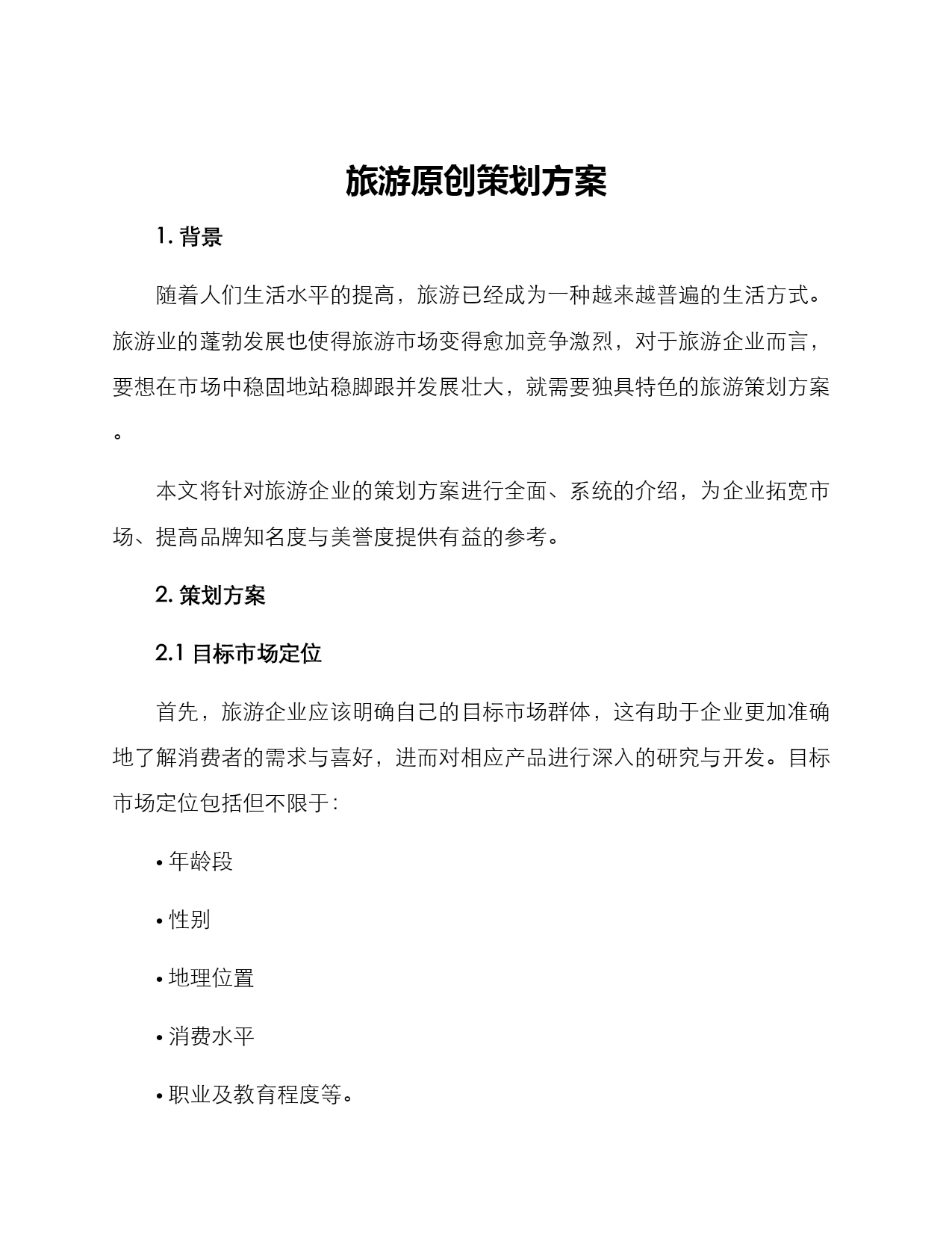 旅游原创策划方案1.背景随着人们生活水平的提高,旅游已经成为一种越来越普遍的生活方式。旅游业的蓬勃发展也使得旅游市场变得愈加竞争激烈,对于旅游企业而言,要想在市场中稳固地站稳脚跟并发展壮大,就需要独具特色的旅游策划方案。本文将针对旅游企业的策划方案进行全面、系统的介绍,为企业拓宽市场、提高品牌知名度与美誉度提供有益的参考。2.策划方案2.1目标市场定位首先,旅游企业应该明确自己的目标市场群体,这有助于企业更加准确地了解消费者的需求与喜好,进而对相应产品进行深入的研究与开发。目标市场定位包括但不限于:年龄段