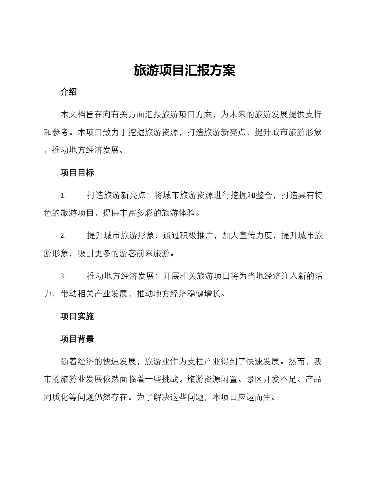 旅游项目汇报方案介绍本文档旨在向有关方面汇报旅游项目方案,为未来的旅游发展提供支持和参考。本项目致力于挖掘旅游资源,打造旅游新亮点,提升城市旅游形象,推动地方经济发展。项目目标打造旅游新亮点:将城市旅游资源进行挖掘和整合,打造具有特色的旅游项目,提供丰富多彩的旅游体验。提升城市旅游形象:通过积极推广,加大宣传力度,提升城市旅游形象,吸引更多的游客前来旅游。推动地方经济发展:开展相关旅游项目将为当地经济注入新的活力,带动相关产业发展,推动地方经济稳健增长。项目实施项目背景随着经济的快速发展,旅游业作为支柱产