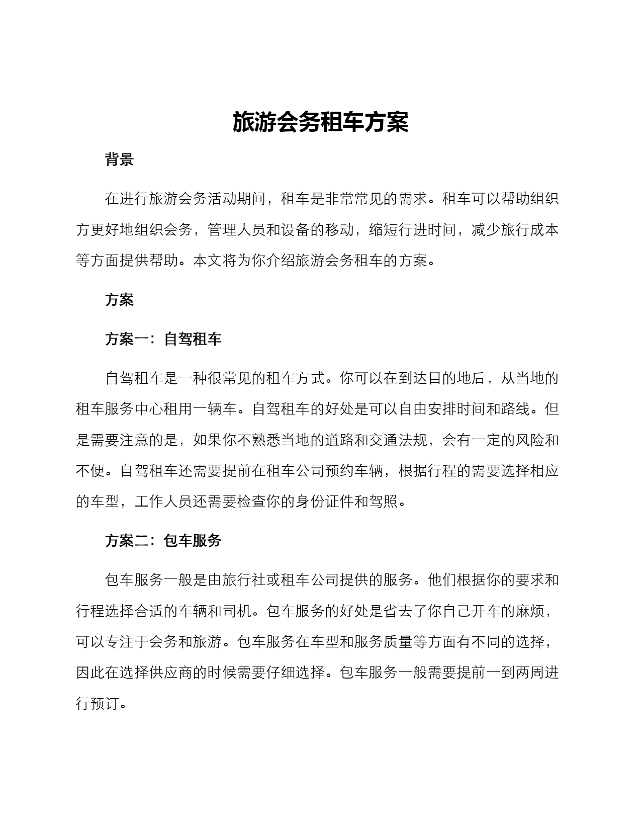 旅游会务租车方案背景在进行旅游会务活动期间,租车是非常常见的需求。租车可以帮助组织方更好地组织会务,管理人员和设备的移动,缩短行进时间,减少旅行成本等方面提供帮助。本文将为你介绍旅游会务租车的方案。方案方案一:自驾租车自驾租车是一种很常见的租车方式。你可以在到达目的地后,从当地的租车服务中心租用一辆车。自驾租车的好处是可以自由安排时间和路线。但是需要注意的是,如果你不熟悉当地的道路和交通法规,会有一定的风险和不便。自驾租车还需要提前在租车公司预约车辆,根据行程的需要选择相应的车型,工作人员还需要检查你的身