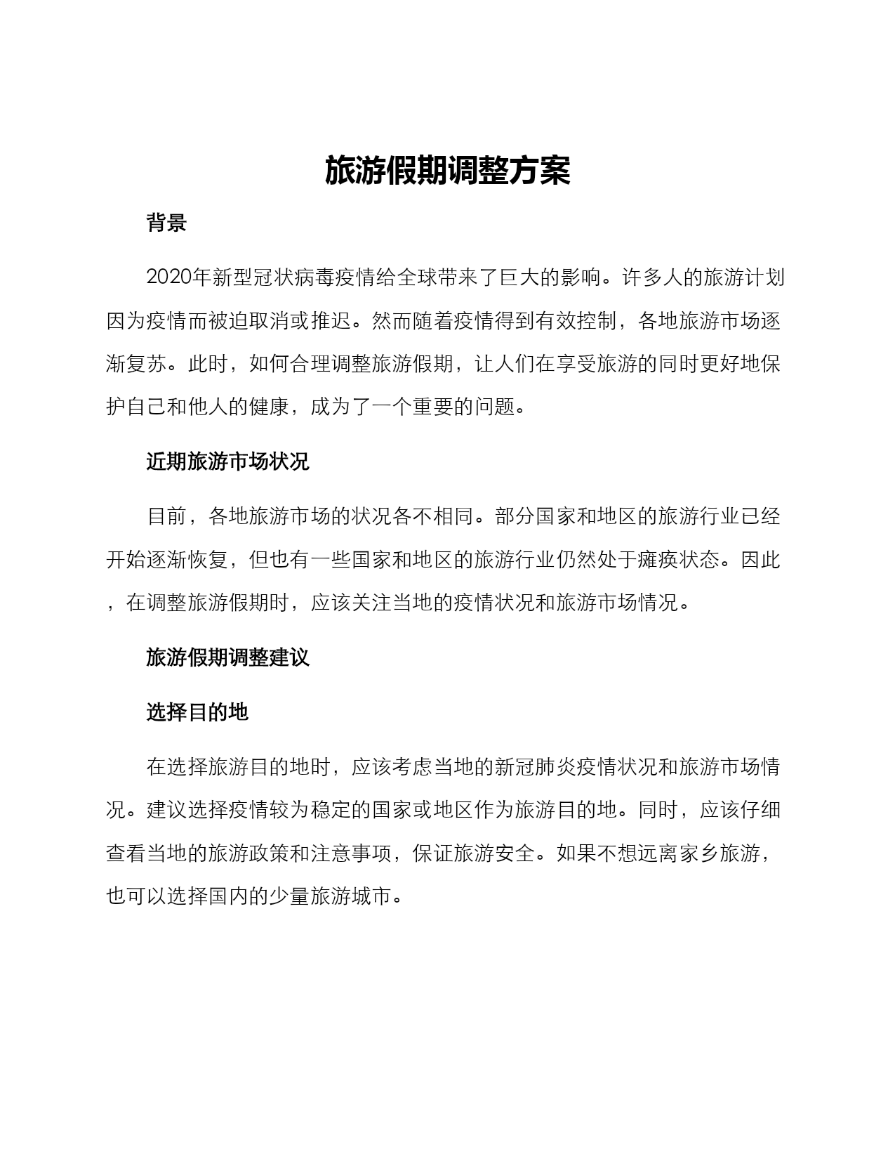 旅游假期调整方案背景2020年新型冠状病毒疫情给全球带来了巨大的影响。许多人的旅游计划因为疫情而被迫取消或推迟。然而随着疫情得到有效控制,各地旅游市场逐渐复苏。此时,如何合理调整旅游假期,让人们在享受旅游的同时更好地保护自己和他人的健康,成为了一个重要的问题。近期旅游市场状况目前,各地旅游市场的状况各不相同。部分国家和地区的旅游行业已经开始逐渐恢复,但也有一些国家和地区的旅游行业仍然处于瘫痪状态。因此,在调整旅游假期时,应该关注当地的疫情状况和旅游市场情况。旅游假期调整建议选择目的地在选择旅游目的地时,应