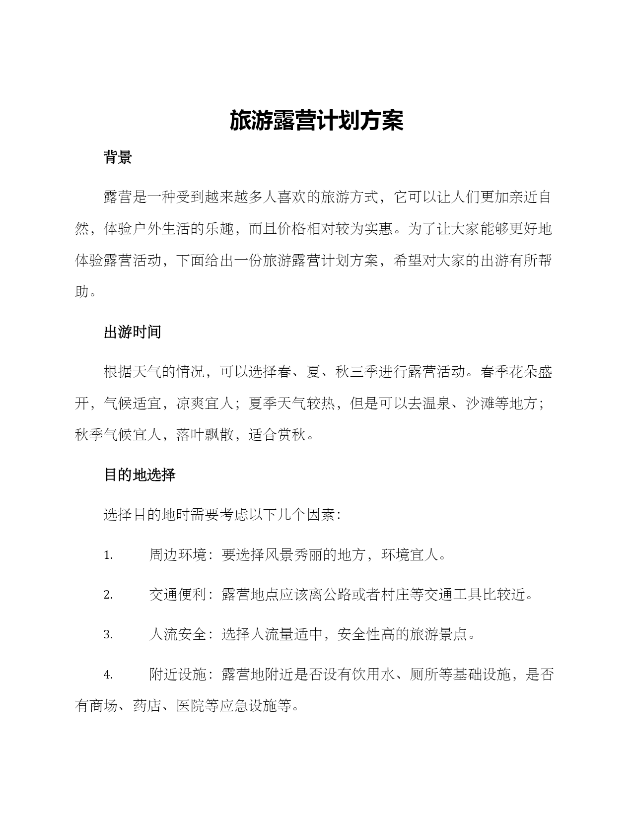 旅游露营计划方案背景露营是一种受到越来越多人喜欢的旅游方式,它可以让人们更加亲近自然,体验户外生活的乐趣,而且价格相对较为实惠。为了让大家能够更好地体验露营活动,下面给出一份旅游露营计划方案,希望对大家的出游有所帮助。出游时间根据天气的情况,可以选择春、夏、秋三季进行露营活动。春季花朵盛开,气候适宜,凉爽宜人;夏季天气较热,但是可以去温泉、沙滩等地方;秋季气候宜人,落叶飘散,适合赏秋。目的地选择选择目的地时需要考虑以下几个因素:周边环境:要选择风景秀丽的地方,环境宜人。交通便利:露营地点应该离公路或者村庄