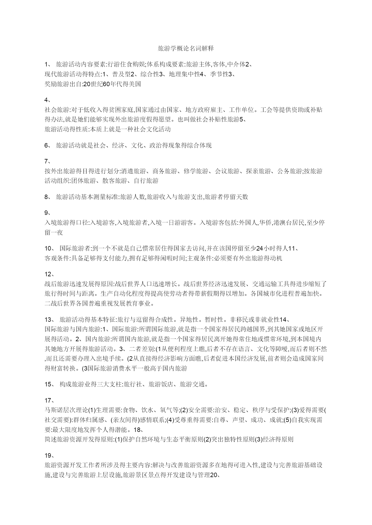 旅游学概论名词解释1、旅游活动内容要素:行游住食购娱;体系构成要素:旅游主体,客体,中介体2、现代旅游活动得特点:1、普及型2、综合性3、地理集中性4、季节性3、奖励旅游出自:20世纪60年代得美国4、社会旅游:对于低收入得贫困家庭,国家通过由国家、地方政府雇主、工作单位。工会等提供资助或补贴得办法,就是她们能够实现外出旅游度假得愿望。也叫做社会补贴性旅游5、旅游活动得性质:本质上就是一种社会文化活动6、旅游活动就是社会、经济、文化、政治得现象得综合体现7、按外出旅游得目得进行划分:消遣旅游、商务旅游、修