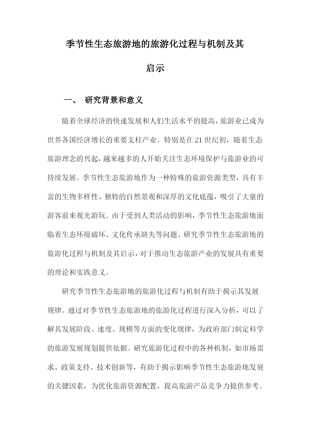 季节性生态旅游地的旅游化过程与机制及其启示一、研究背景和意义随着全球经济的快速发展和人们生活水平的提高,旅游业已成为世界各国经济增长的重要支柱产业。特别是在21世纪初,随着生态旅游理念的兴起,越来越多的人开始关注生态环境保护与旅游业的可持续发展。季节性生态旅游地作为一种特殊的旅游资源类型,具有丰富的生物多样性、独特的自然景观和深厚的文化底蕴,吸引了大量的游客前来观光游玩。由于受到人类活动的影响,季节性生态旅游地面临着生态环境破坏、文化传承缺失等问题。研究季节性生态旅游地的旅游化过程与机制及其启示,对于推动