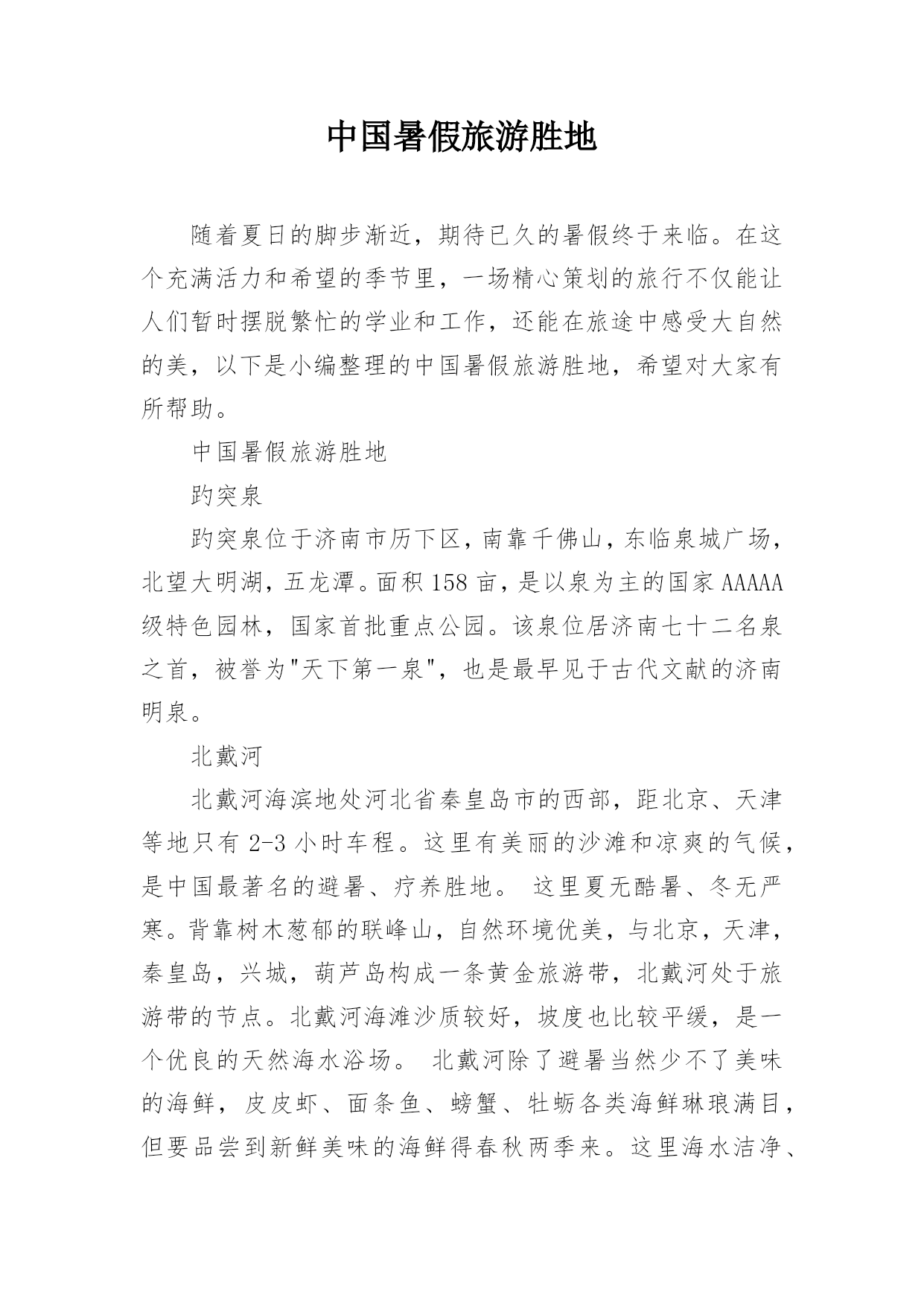 中国暑假旅游胜地随着夏日的脚步渐近,期待已久的暑假终于来临。在这个充满活力和希望的季节里,一场精心策划的旅行不仅能让人们暂时摆脱繁忙的学业和工作,还能在旅途中感受大自然的美,以下是小编整理的中国暑假旅游胜地,希望对大家有所帮助。中国暑假旅游胜地趵突泉趵突泉位于济南市历下区,南靠千佛山,东临泉城广场,北望大明湖,五龙潭。面积158亩,是以泉为主的国家AAAAA级特色园林,国家首批重点公园。该泉位居济南七十二名泉之首,被誉为"天下第一泉",也是最早见于古代文献的济南明泉。北戴河北戴河海滨地处河北省秦皇岛市的西
