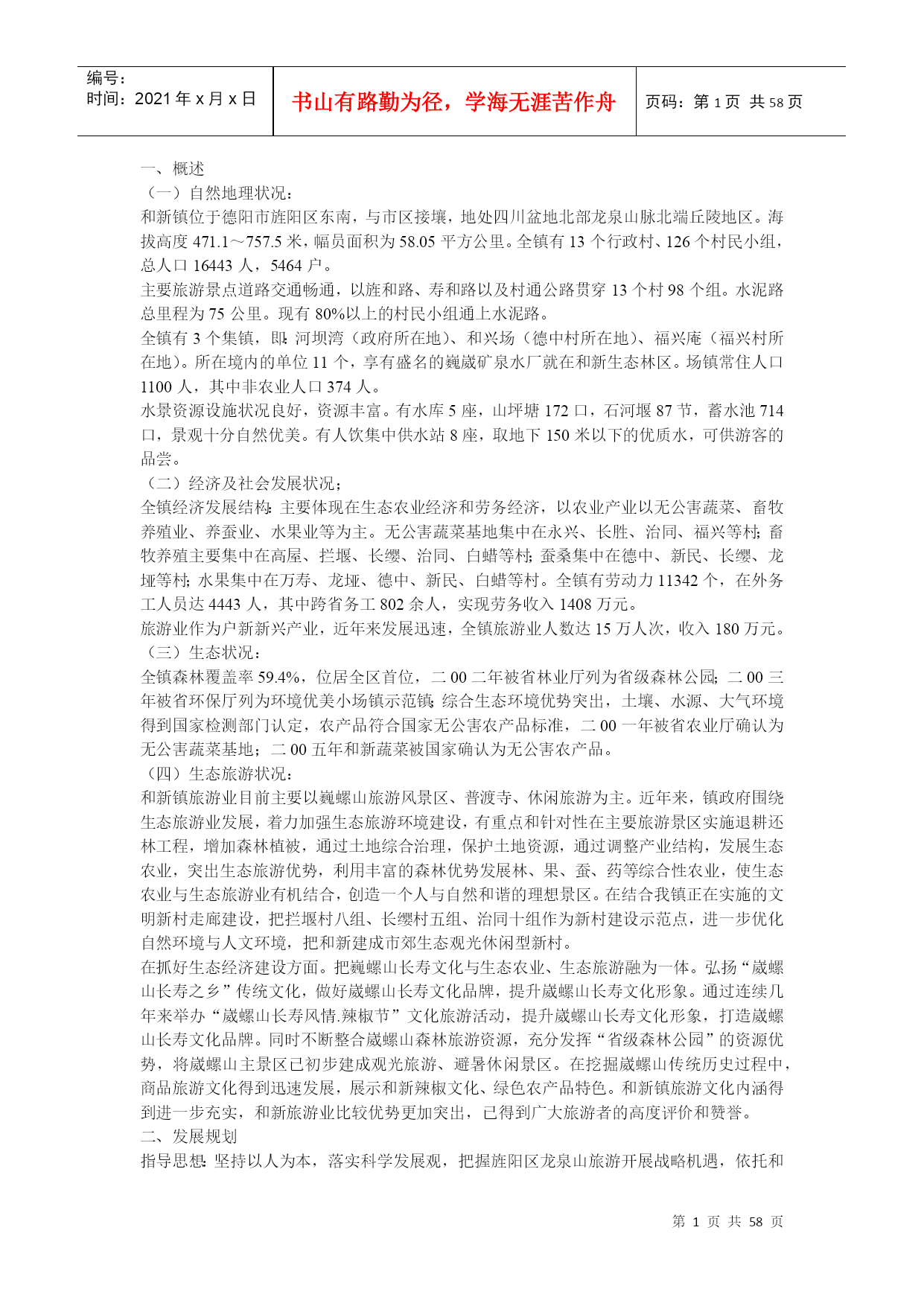 编号:时间:2021年x月x日书山有路勤为径,学海无涯苦作舟页码:第PAGE58页共NUMPAGES58页第PAGE\*MERGEFORMAT58页共NUMPAGES\*MERGEFORMAT58页一、概述(一)自然地理状况:和新镇位于德阳市旌阳区东南,与市区接壤,地处四川盆地北部龙泉山脉北端丘陵地区。海拔高度471.1~757.5米,幅员面积为58.05平方公里。全镇有13个行政村、126个村民小组,总人口16443人,5464户。主要旅游景点道路交通畅通,以旌和路、寿和路以及村