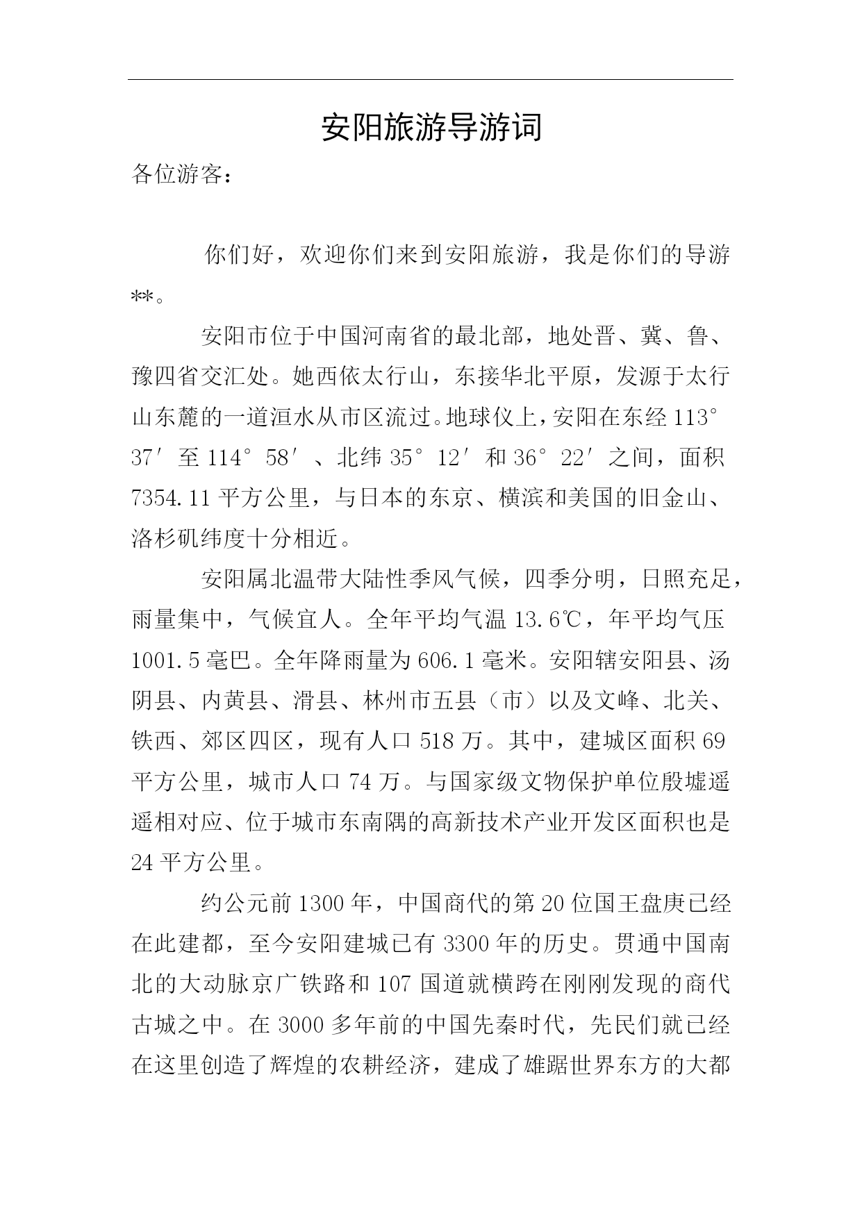安阳旅游导游词各位游客:你们好,欢迎你们来到安阳旅游,我是你们的导游**。安阳市位于中国河南省的最北部,地处晋、冀、鲁、豫四省交汇处。她西依太行山,东接华北平原,发源于太行山东麓的一道洹水从市区流过。地球仪上,安阳在东经113°37′至114°58′、北纬35°12′和36°22′之间,面积7354.11平方公里,与日本的东京、横滨和美国的旧金山、洛杉矶纬度十分相近。安阳属北温带大陆性季风气候,四季分明,日照充足,雨量集中,气候宜人。全年平均气温13.6℃,年平均气压1001.5毫巴。全年降雨量为606.