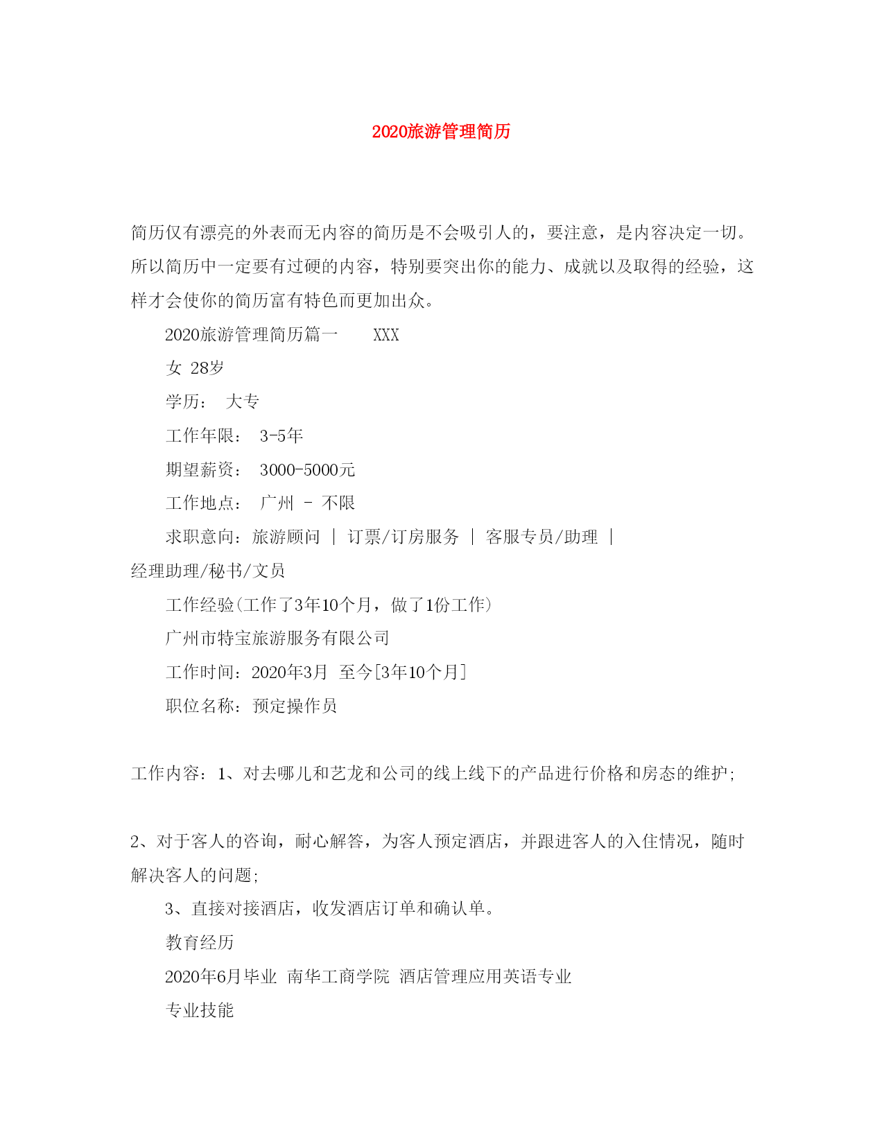 此资料由网络收集而来,如有侵权请告知上传者立即删除。资料共分享,我们负责传递知识。2020旅游管理简历简历仅有漂亮的外表而无内容的简历是不会吸引人的,要注意,是内容决定一切。所以简历中一定要有过硬的内容,特别要突出你的能力、成就以及取得的经验,这样才会使你的简历富有特色而更加出众。2020旅游管理简历篇一XXX女28岁学历:大专工作年限:3-5年期望薪资:3000-5000元工作地点:广州-不限求职意向:旅游顾问|订票/订房服务|客服专员/助理|经理助理/秘书/文员工作经验(工作了3年10个月,做了1份工