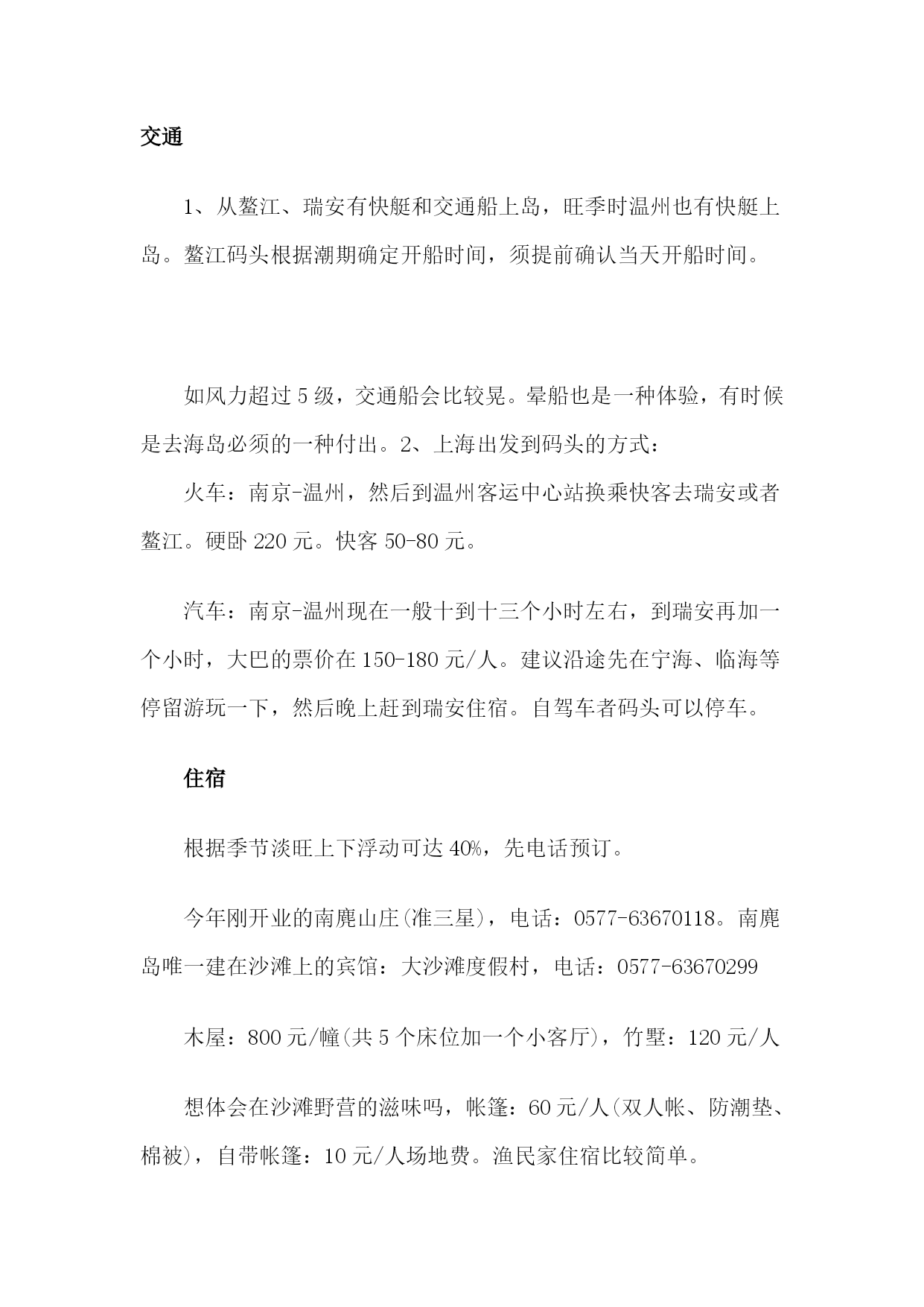 交通1、从鳌江、瑞安有快艇和交通船上岛,旺季时温州也有快艇上岛。鳌江码头根据潮期确定开船时间,须提前确认当天开船时间。如风力超过5级,交通船会比较晃。晕船也是一种体验,有时候是去海岛必须的一种付出。2、上海出发到码头的方式:火车:南京-温州,然后到温州客运中心站换乘快客去瑞安或者鳌江。硬卧220元。快客50-80元。汽车:南京-温州现在一般十到十三个小时左右,到瑞安再加一个小时,大巴的票价在150-180元/人。建议沿途先在宁海、临海等停留游玩一下,然后晚上赶到瑞安住宿。自驾车者码头可以停车。住宿根据季节