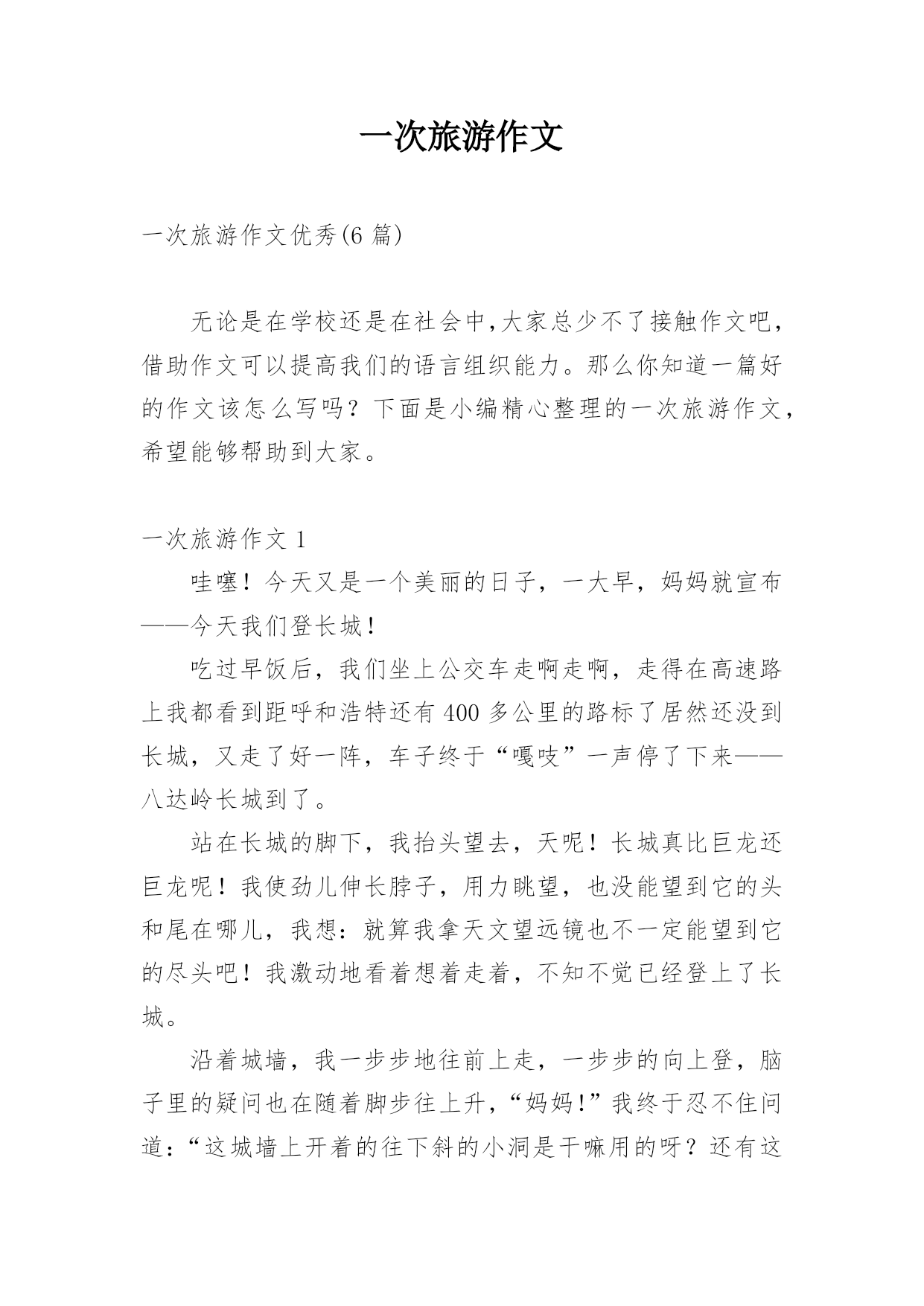 一次旅游作文一次旅游作文优秀(6篇)无论是在学校还是在社会中,大家总少不了接触作文吧,借助作文可以提高我们的语言组织能力。那么你知道一篇好的作文该怎么写吗?下面是小编精心整理的一次旅游作文,希望能够帮助到大家。一次旅游作文1哇噻!今天又是一个美丽的日子,一大早,妈妈就宣布——今天我们登长城!吃过早饭后,我们坐上公交车走啊走啊,走得在高速路上我都看到距呼和浩特还有400多公里的路标了居然还没到长城,又走了好一阵,车子终于“嘎吱”一声停了下来——八达岭长城到了。站在长城的脚下,我抬头望去,天呢!长城真比巨龙还