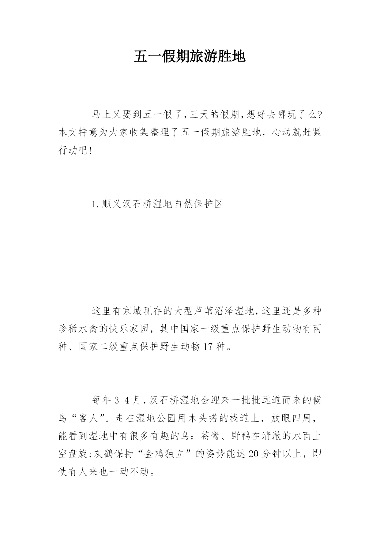 五一假期旅游胜地马上又要到五一假了,三天的假期,想好去哪玩了么?本文特意为大家收集整理了五一假期旅游胜地,心动就赶紧行动吧!1.顺义汉石桥湿地自然保护区这里有京城现存的大型芦苇沼泽湿地,这里还是多种珍稀水禽的快乐家园,其中国家一级重点保护野生动物有两种、国家二级重点保护野生动物17种。每年3-4月,汉石桥湿地会迎来一批批远道而来的候鸟“客人”。走在湿地公园用木头搭的栈道上,放眼四周,能看到湿地中有很多有趣的鸟:苍鹭、野鸭在清澈的水面上空盘旋;灰鹤保持“金鸡独立”的姿势能达20分钟以上,即使有人来也一动不动